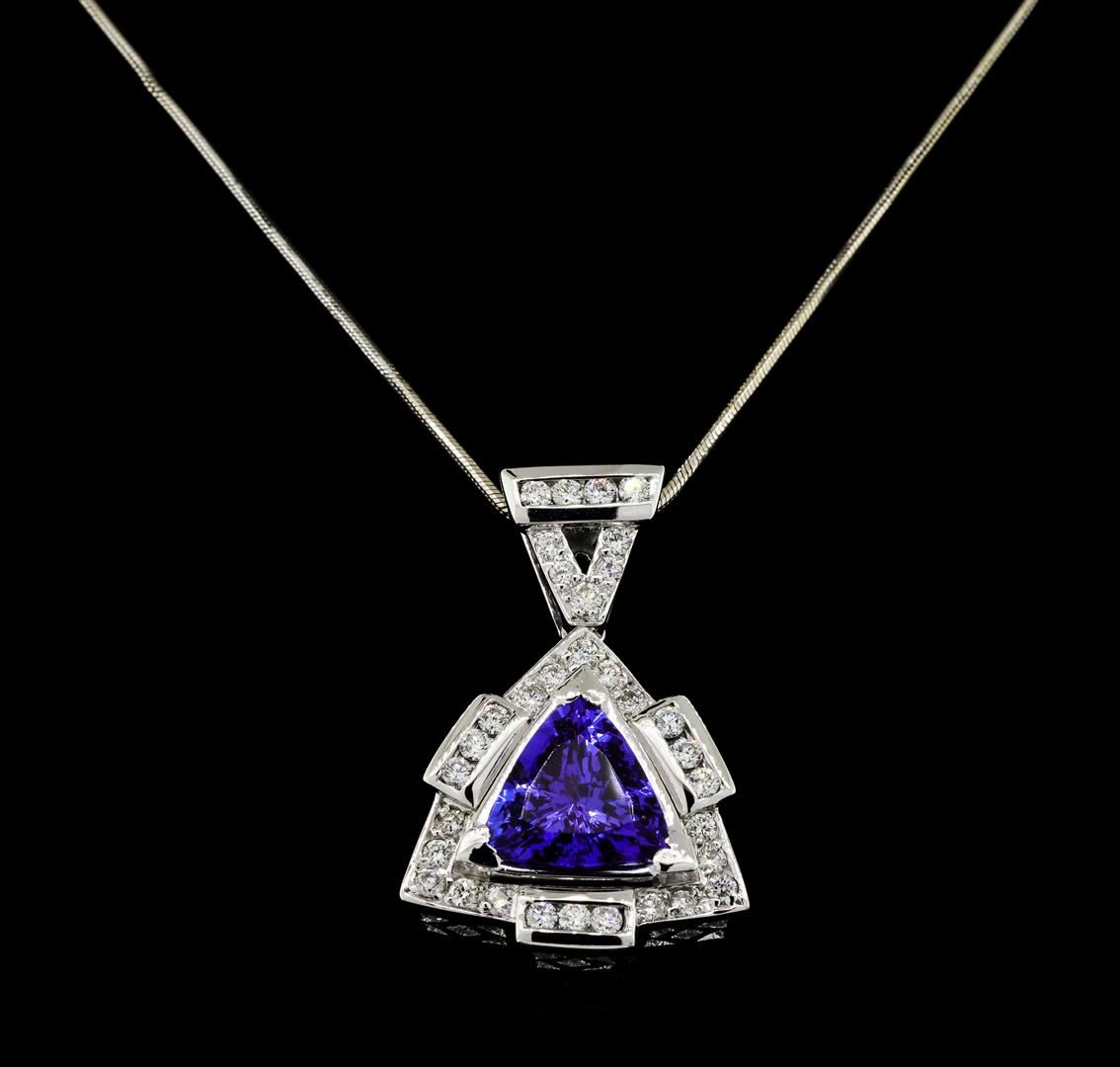 One electronically tested 14KT white gold lady's combination cast & assembled fashion pendant & chain 18.0' long, 1mm square snake chain with a lobster claw clasp with a bright polish finish. Identified with markings of '14K'. Condition is new, good workmanship. Containing: One prong set triangle modified brilliant cut natural tanzanite, measuring 11.90 x 11.40 x 6.74mm, (depth est.) approximate weight of 5.51ct., clarity is eye clean, medium dark, very slightly grayish, violetish blue color, (GIA vB 6/3), cut is very good. Transmitting light with no distortion, transparent. Colored gemstones are presumed to have been subjected to commonly used enhancement processes. Graded in the setting. Thirty-Three channel and prong set round brilliant cut diamonds, measuring 2.10 - 1.90 x 1.24mm (depth est.) approximate total weight of 33 Stones = 1.00ct. Graded in the setting. Color H - I Clarity SI-1 to SI-2 Cut Good. Total Weight of Colored Stones 5.51ct.. Total Weight of Diamonds 1.00ct.. Total Weight of Pendant & Chain 16.50gm GAS Appraised at $11725.00. GAS Appraised at $11,725.00.