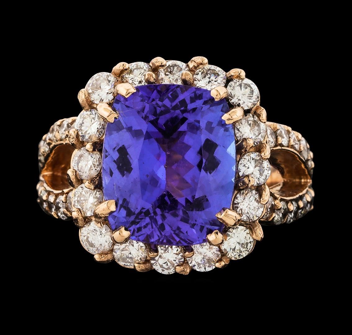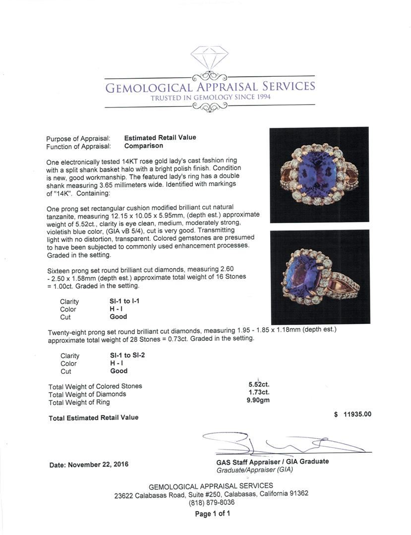 One electronically tested 14KT rose gold lady's cast fashion ring with a split shank basket halo with a bright polish finish. The featured lady's ring has a double shank measuring 3.65 millimeters wide. Identified with markings of '14K'. Condition is new, good workmanship. Containing: One prong set rectangular cushion modified brilliant cut natural tanzanite, measuring 12.15 x 10.05 x 5.95mm, (depth est.) approximate weight of 5.52ct., clarity is eye clean, medium, moderately strong, violetish blue color, (GIA vB 5/4), cut is very good. Transmitting light with no distortion, transparent. Colored gemstones are presumed to have been subjected to commonly used enhancement processes. Graded in the setting. Sixteen prong set round brilliant cut diamonds, measuring 2.60 - 2.50 x 1.58mm (depth est.) approximate total weight of 16 Stones = 1.00ct. Graded in the setting. Clarity SI-1 to I-1. Color: H - I Cut Good Twenty-Eight prong set round brilliant cut diamonds, measuring 1.95 - 1.85 x 1.18mm (depth est.) approximate total weight of 28 Stones = 0.73ct. Graded in the setting. Clarity SI-1 to SI-2. Color: H - I Cut Good. Total Weight of Colored Stones 5.52ct.. Total Weight of Diamonds 1.73ct.. Total Weight of Ring 9.90gm. GAS Appraised at $11,935.00.