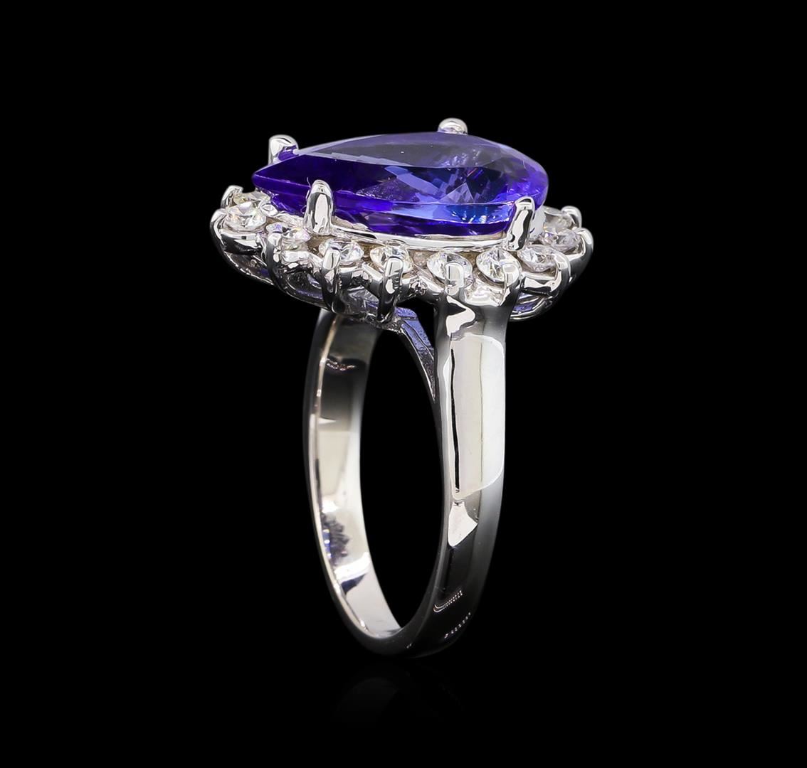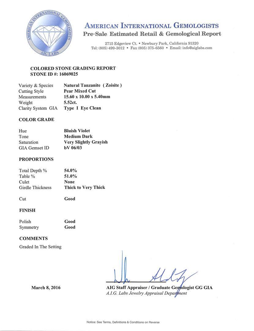 One electronically tested 14KT white gold ladies cast tanzanite and diamond ring with a bright polish finish. The featured tanzanite is set within a diamond floret supported by a ribbed under gallery, completed by a two millimeter wide band. Identified with markings of "14K". Condition is new, good workmanship. Containing: One prong set pear mixed cut natural tanzanite, measuring 15.60 x 10.00 x 5.40mm, approximate weight of 5.52ct., clarity is eye clean, type I, medium dark, very slightly grayish, bluish violet color, (GIA bV 6/3), cut is good. Transmitting light with no distortion, transparent. Colored Stone Grading Report attached. Graded in the setting. Tanzanite is a very rare gemstone that is only found in the country of Tanzania. Originally discovered in 1967. Tiffany & Company, named the stone Tanzanite. It is found in the Usumburu Mountains that border the Umba Valley of northern Tanzania. Tanzanite occurs in gray, brown, violet, blue, reddish-purple, & green. The gem is interesting because of its exceptional pleochroism. Rotated in different directions a tanzanite will exhibit multiple changes of color. Tanzanite has a low tolerance to ultrasonic cleaning, and should not be cleaned using this method. Sixteen prong set round brilliant cut diamonds approximate total weight of 16 Stones = 0.77ct. Clarity grade is an average for the group. Graded in the setting. Clarity: SI-1 to SI-2. Color: D - F. Total Weight of Colored Stones 5.52ct. Total Weight of Diamonds 0.77ct. Total Weight of Ring 7.17gm. AIG Appraised at $15,915.00.