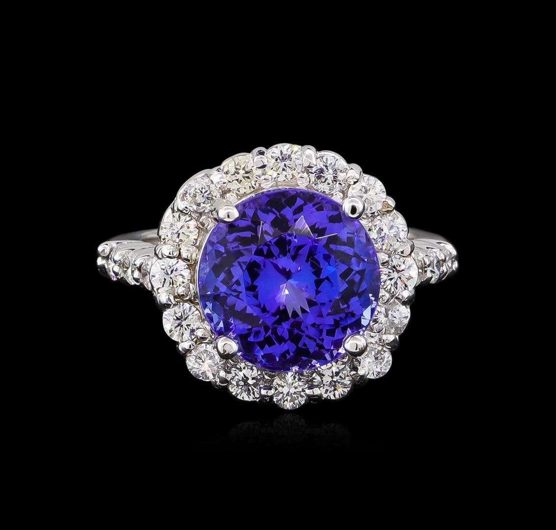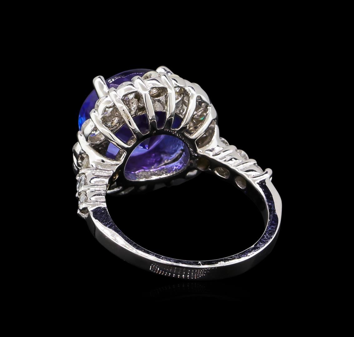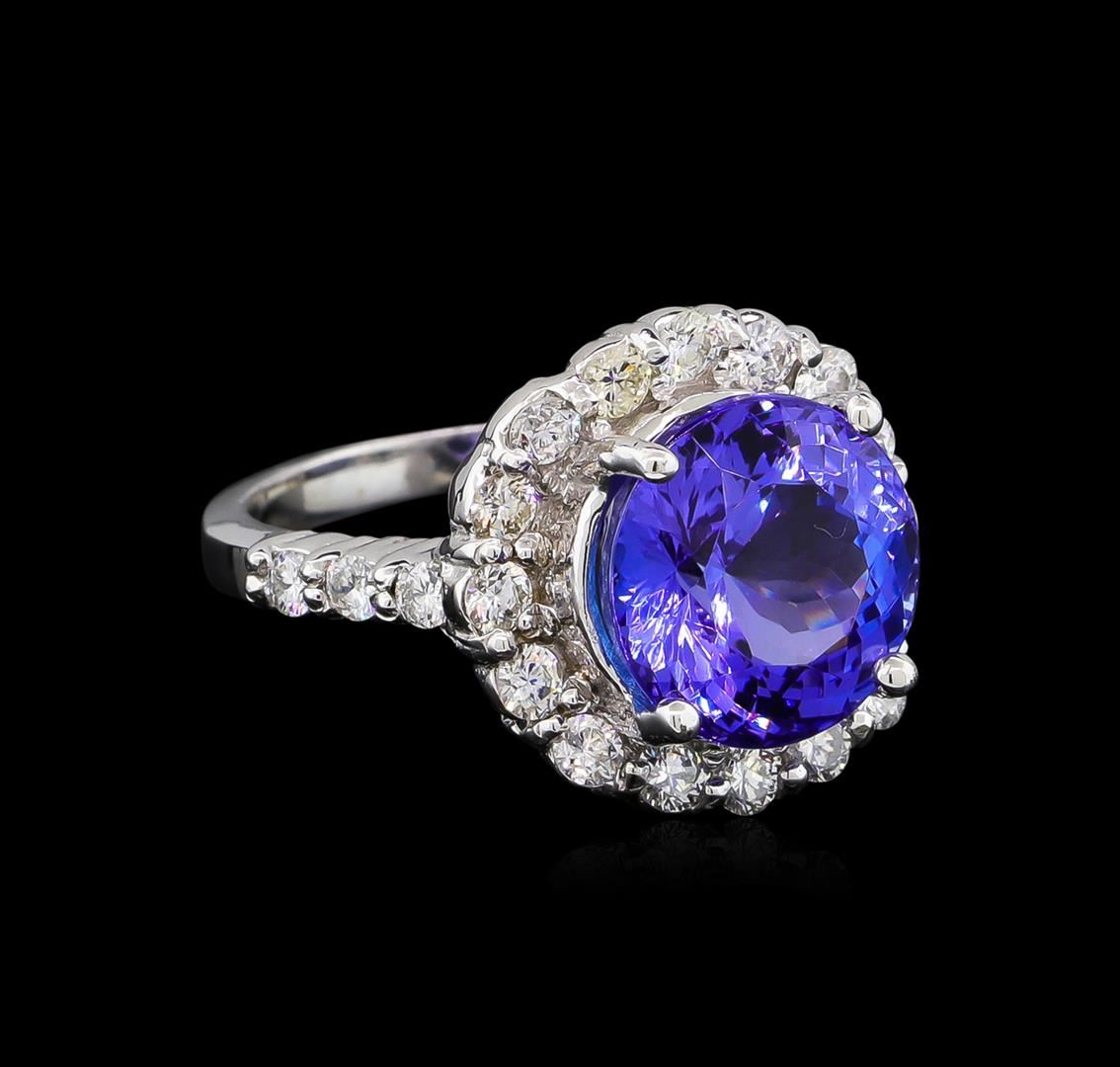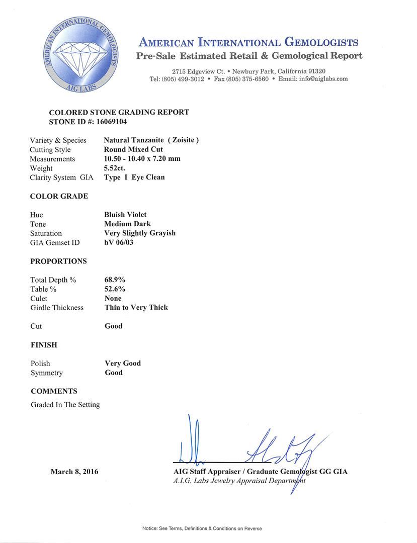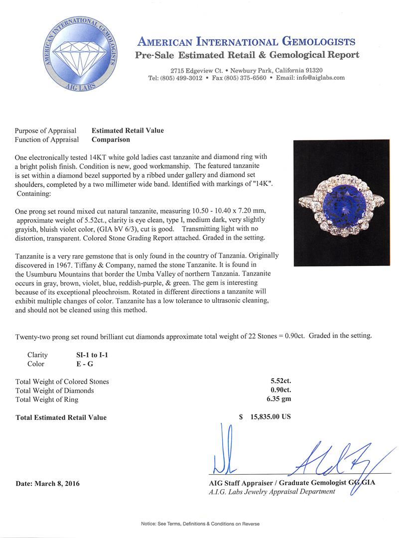 One electronically tested 14KT white gold ladies cast tanzanite and diamond ring with a bright polish finish. The featured tanzanite is set within a diamond bezel supported by a ribbed under gallery and diamond set shoulders, completed by a two millimeter wide band. Identified with markings of "14K". Condition is new, good workmanship. Containing: One prong set round mixed cut natural tanzanite, measuring 10.50 - 10.40 x 7.20 mm, approximate weight of 5.52ct., clarity is eye clean, type I, medium dark, very slightly grayish, bluish violet color, (GIA bV 6/3), cut is good. Transmitting light with no distortion, transparent. Colored Stone Grading Report attached. Graded in the setting. Tanzanite is a very rare gemstone that is only found in the country of Tanzania. Originally discovered in 1967. Tiffany & Company, named the stone Tanzanite. It is found in the Usumburu Mountains that border the Umba Valley of northern Tanzania. Tanzanite occurs in gray, brown, violet, blue, reddish-purple, & green. The gem is interesting because of its exceptional pleochroism. Rotated in different directions a tanzanite will exhibit multiple changes of color. Tanzanite has a low tolerance to ultrasonic cleaning, and should not be cleaned using this method. Twenty-Two prong set round brilliant cut diamonds approximate total weight of 22 Stones = 0.90ct. Graded in the setting. Clarity: SI-1 to I-1. Color: E - G. Total Weight of Colored Stones 5.52ct. Total Weight of Diamonds 0.90ct. Total Weight of Ring 6.35gm. AIG Appraised at $15,835.00.