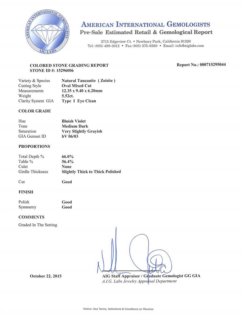 One electronically tested 14KT white gold ladies cast tanzanite and diamond ring with a bright polish finish. The featured tanzanite is set within a stylized diamond bezel supported by diamond set shoulders, completed by a two and one-half millimeter wide band. Identified with markings of "K14". Condition is new, good workmanship. Containing: One prong set oval mixed cut natural tanzanite, measuring 12.35 x 9.40 x 6.20mm, 8% bulge factor, exact weight 5.52ct., clarity is eye clean, type I, medium dark, very slightly grayish, bluish violet color, (GIA bV 6/3), cut is good. Transmitting light with no distortion, transparent. Colored Stone Grading Report attached. Graded in the setting. Tanzanite is a very rare gemstone that is only found in the country of Tanzania. Originally discovered in 1967. Tiffany & Company, named the stone Tanzanite. It is found in the Usumburu Mountains that border the Umba Valley of northern Tanzania. Tanzanite occurs in gray, brown, violet, blue, reddish-purple, & green. The gem is interesting because of its exceptional pleochroism. Rotated in different directions a tanzanite will exhibit multiple changes of color. Tanzanite has a low tolerance to ultrasonic cleaning, and should not be cleaned using this method. Forty-Two prong set round brilliant cut diamonds, measuring 1.70 - 1.50 x 0.96mm exact total weight 42 Stones = 0.58ct. Graded in the setting. Clarity: SI-2 to I-1. Color: F - H. Total Weight of Colored Stones 5.52ct. Total Weight of Diamonds 0.58ct. Total Weight of Ring 6.51gm. AIG Appraised at $15,480.00.