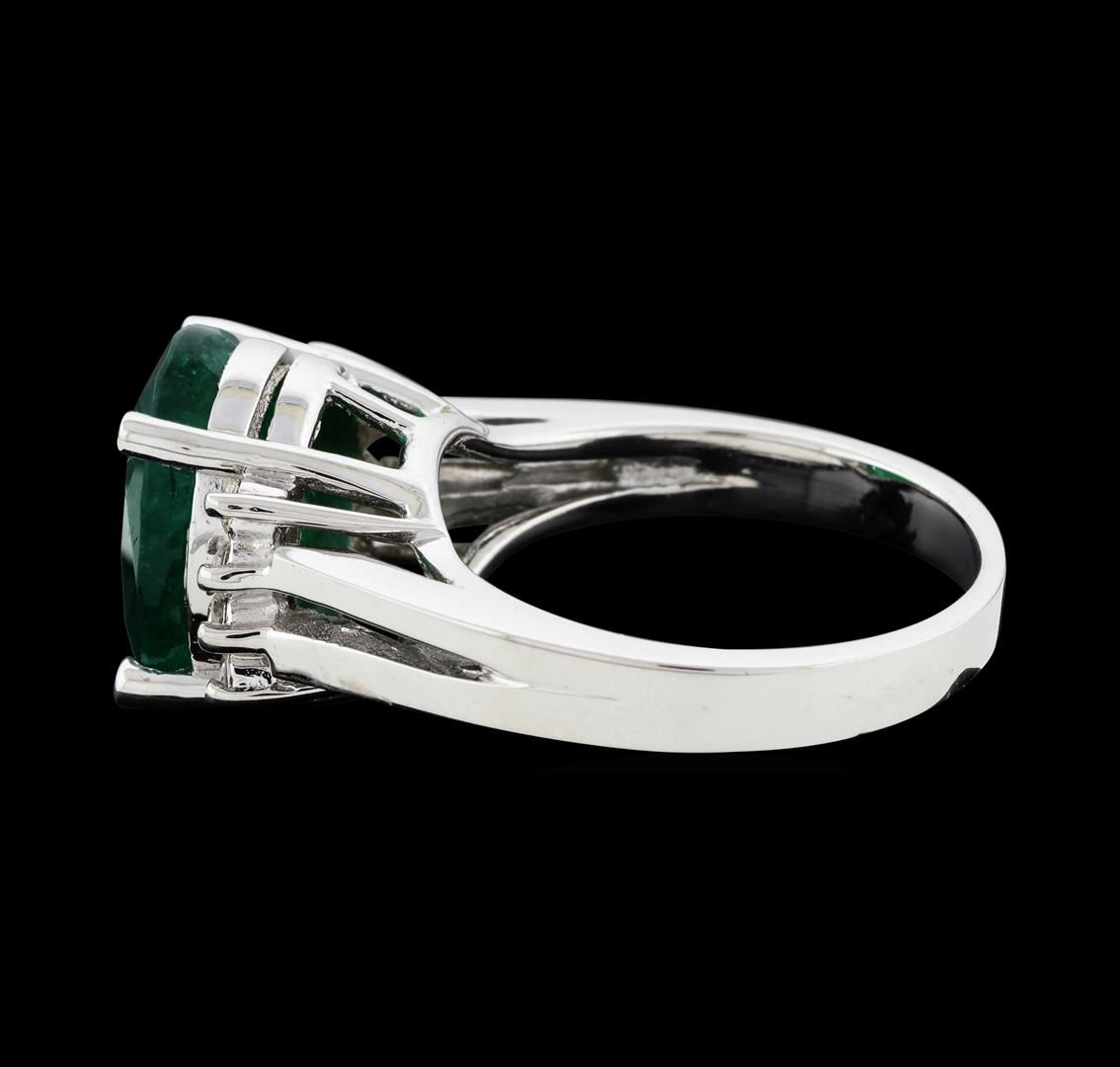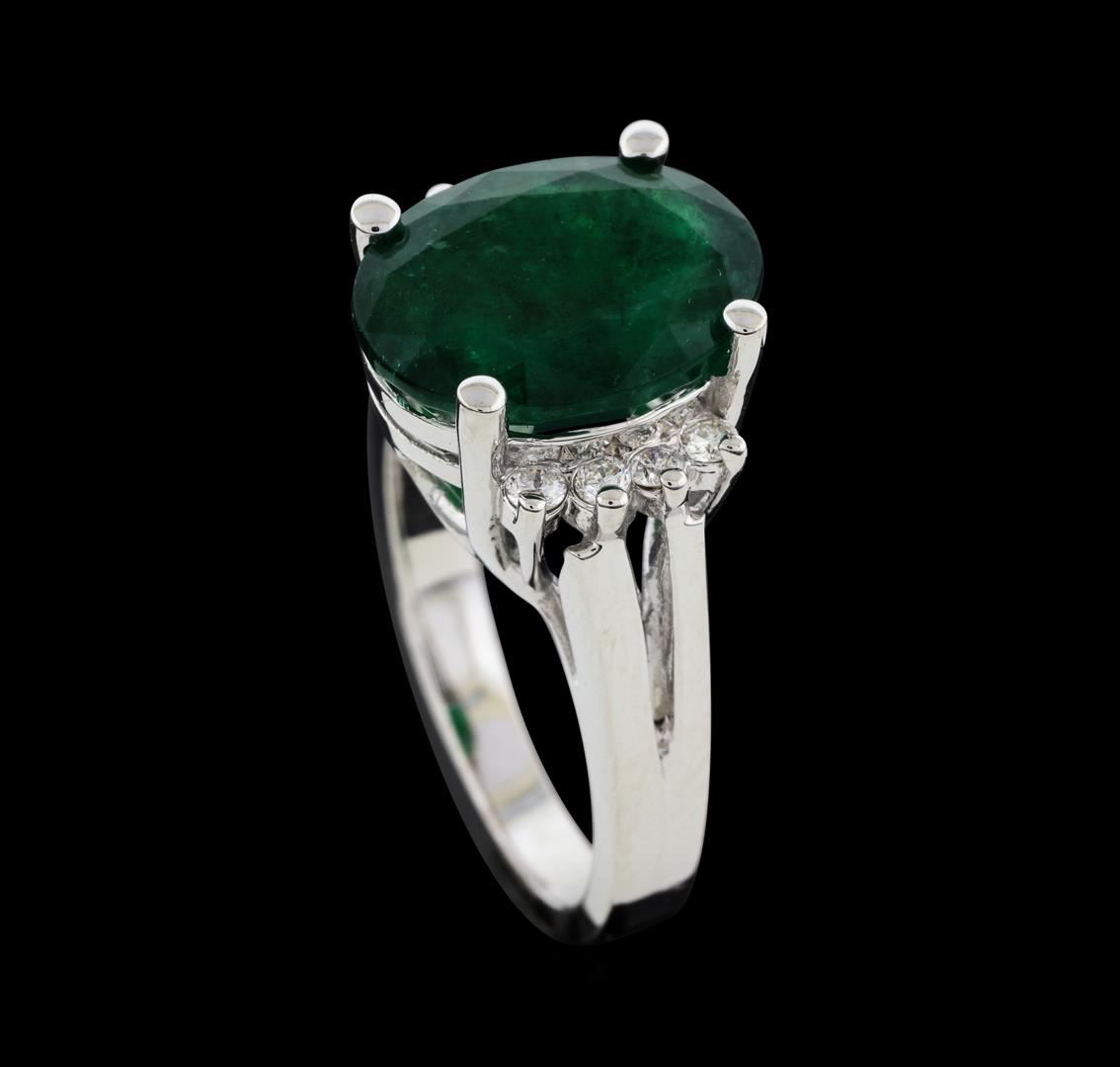One electronically tested 14KT white gold lady's cast fashion ring with a split cathedral shank with a bright polish finish. The featured lady's ring has diamond set shoulders and a shank measuring 2.66 millimeters wide. Identified with markings of '14K'. Condition is new, good workmanship. Containing: One prong set oval modified mixed cut natural emerald, measuring 13.40 x 10.03 x 5.91mm, (depth est.) 15%. bulge factor, approximate weight of 5.53ct., clarity is heavily included, medium dark, moderately strong, green color, (GIA G 6/4), cut is good. Transmitting light somewhat diffusely, semi-transparent to translucent. Indications of oil residue. Naturally occurring internal & external characteristics are present. Colored gemstones are presumed to have been subjected to commonly used enhancement processes. Graded in the setting. Eight prong set round brilliant cut diamonds, measuring 2.00 - 1.90 x 1.21mm (depth est.) approximate total weight of 8 Stones = 0.23ct. Graded in the setting. Clarity VS-2 to SI-2. Color: G - H Cut Good. Total Weight of Colored Stones 5.53ct.. Total Weight of Diamonds 0.23ct.. Total Weight of Ring 7.20gm. GAS Appraised at $6,520.00.
