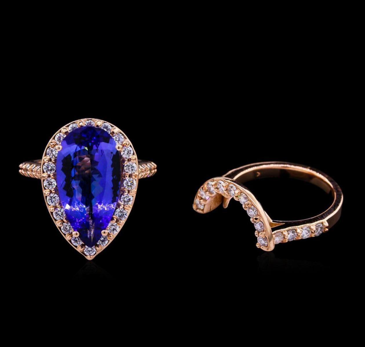 One set electronically tested 14KT rose gold lady's cast fashion rings with a halo with a bright polish finish. The featured lady's ring set has a double shank measuring 4.56 millimeters wide. Condition is new, good workmanship. Containing: One prong set pear modified brilliant cut natural tanzanite, measuring 18.15 x 9.78 x 4.71mm, approximate weight of 5.53ct., clarity is eye clean, type I, medium, moderately strong, violetish blue color, (GIA vB 5/4), cut is very good. Transmitting light with no distortion, transparent. Colored gemstones are presumed to have been subjected to commonly used enhancement processes. Graded in the setting. Forty-Seven prong set round brilliant cut diamonds, measuring 2.10 - 1.90 x 1.20mm (depth est.) approximate total weight of 47 Stones = 1.38ct. Graded in the setting. Clarity: VS-2 to SI-1. Color: G - Good. Total Weight of Colored Stones 5.53ct. Total Weight of Diamonds 1.38ct. Total Weight of Rings 10.50gm. GAS Appraised.