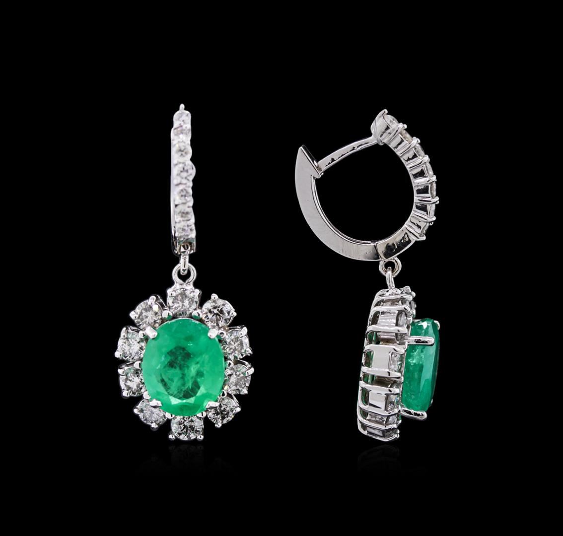 One pair electronically tested 14KT white gold ladies cast emerald and diamond earrings with hinged clip backs with a bright polish finish. Identified with markings of "14K". Condition is new. Containing: Two prong set oval modified brilliant cut natural emeralds, measuring 10.30 x 8.50 x 5.53mm, approximate total weight of 5.54ct., clarity is moderately included, type III, medium, moderately strong, green color, (GIA G 5/4), cut is good. Fourteen prong set round brilliant cut diamonds, measuring 1.70 - 1.70 x 1.02mm (depth est.) approximate total weight of 14 Stones = 0.25ct. Clarity: SI-1 to SI-2. Color: I - J, Cut is Good. Twenty prong set round brilliant cut diamonds, measuring 3.50 - 3.50 x 2.10mm (depth est.) approximate total weight of 20 Stones = 3.14ct. Clarity: I-1 to I-3. Color: I - J, Cut is Good. Colored gemstones are presumed to have been subjected to commonly used enhancement processes. All diamonds and colored gemstones are graded in the mounting, unless otherwise stated. Total Weight of Colored Stones 5.54ct. Total Weight of Diamonds 3.39ct. Total Weight of Earrings 9.20 grams. GGL Appraised at $8,395.00.