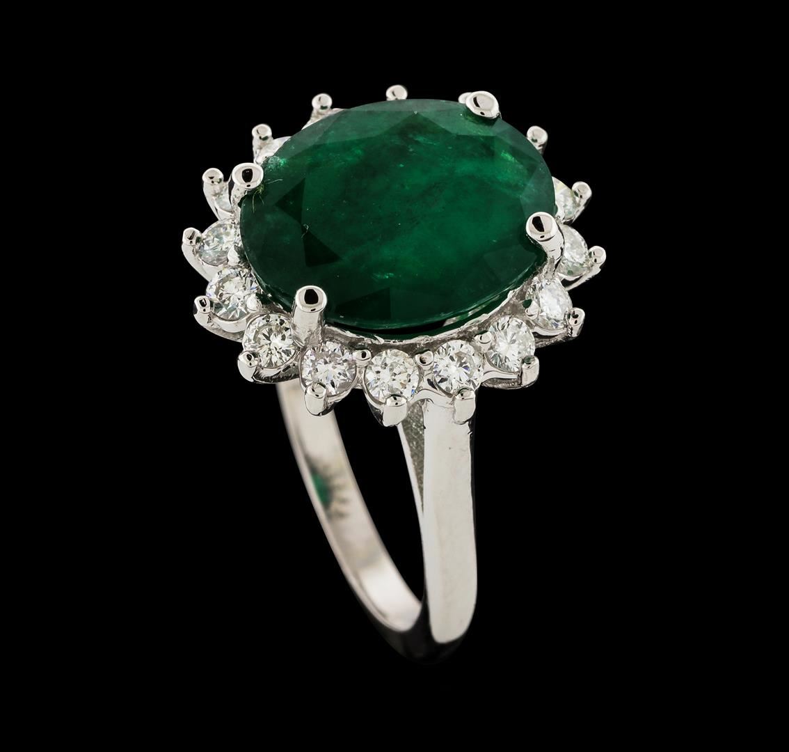 One electronically tested 14KT white gold lady's cast fashion ring with a basket halo with a bright polish finish. The featured lady's ring has a shank measuring 2.04 millimeters wide. Identified with markings of '14K'. Condition is new, good workmanship. Containing: One prong set oval modified mixed cut natural emerald, measuring 13.72 x 10.90 x 5.55mm, (depth est.) 15%. bulge factor, approximate weight of 5.55ct., clarity is heavily included, medium dark, moderately strong, green color, (GIA G 6/4), cut is good. Transmitting light somewhat diffusely, semi-transparent to translucent. Naturally occurring internal & external characteristics are present. Indications of oil residue. Colored gemstones are presumed to have been subjected to commonly used enhancement processes. Graded in the setting. Sixteen prong set round brilliant cut diamonds, measuring 2.40 - 2.30 x 1.46mm (depth est.) approximate total weight of 16 Stones = 0.80ct. Graded in the setting. Clarity SI-1 to SI-2. Color: G - H Cut Good. Total Weight of Colored Stones 5.55ct.. Total Weight of Diamonds 0.80ct.. Total Weight of Ring 6.50gm GAS Appraised at $7,500.00.