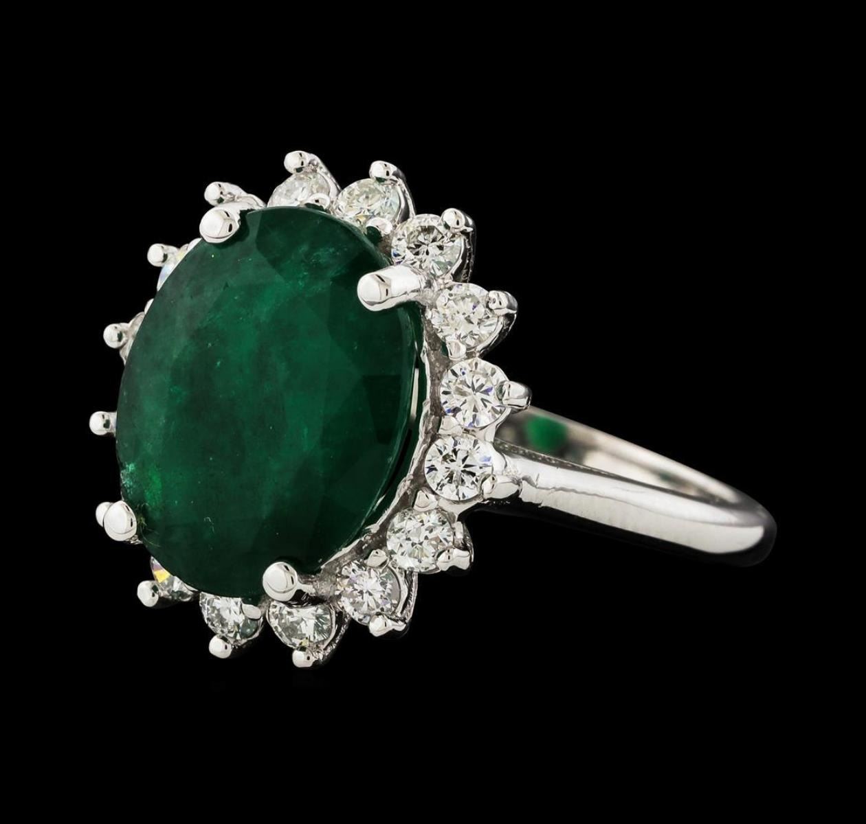 One electronically tested 14KT white gold lady's cast fashion ring with a basket halo with a bright polish finish. The featured lady's ring has a shank measuring 2.04 millimeters wide. Identified with markings of '14K'. Condition is new, good workmanship. Containing: One prong set oval modified mixed cut natural emerald, measuring 13.72 x 10.90 x 5.55mm, (depth est.) 15%. bulge factor, approximate weight of 5.55ct., clarity is heavily included, medium dark, moderately strong, green color, (GIA G 6/4), cut is good. Transmitting light somewhat diffusely, semi-transparent to translucent. Naturally occurring internal & external characteristics are present. Indications of oil residue. Colored gemstones are presumed to have been subjected to commonly used enhancement processes. Graded in the setting. Sixteen prong set round brilliant cut diamonds, measuring 2.40 - 2.30 x 1.46mm (depth est.) approximate total weight of 16 Stones = 0.80ct. Graded in the setting. Clarity SI-1 to SI-2. Color: G - H Cut Good. Total Weight of Colored Stones 5.55ct.. Total Weight of Diamonds 0.80ct.. Total Weight of Ring 6.50gm GAS Appraised.