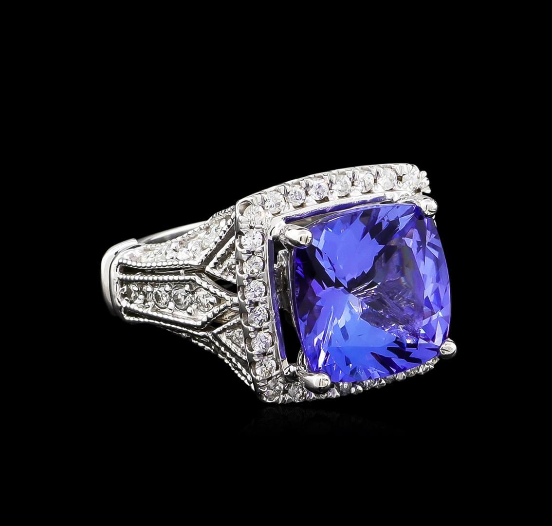One electronically tested 14KT white gold lady's cast fashion ring with a vintage-style shank with halo with a bright polish with milgrain detailing finish. The featured lady's ring has a shank measuring 2.59 millimeters wide. Identified with markings of "14K". Condition is new, good workmanship. Containing: One prong set square cushion modified brilliant cut natural tanzanite, measuring 11.07 x 10.90 x 6.56mm, approximate weight of 5.56ct., clarity is eye clean, type I, medium, moderately strong, bluish violet color, (GIA bV 5/4), cut is very good. Transmitting light with no distortion, transparent. Colored gemstones are presumed to have been subjected to commonly used enhancement processes. Graded in the setting. Eight prong set round brilliant cut diamonds, measuring 2.20 - 2.00 x 1.32mm (depth est.) approximate total weight of 8 Stones = 0.28ct. Graded in the setting. Clarity: SI-1 to I-1. Color: H - I. Cut Good Ten prong set round brilliant cut diamonds, measuring 1.80 - 1.70 x 1.09mm (depth est.) approximate total weight of 10 Stones = 0.20ct. Graded in the setting. Clarity: SI-1 to I-1. Color: H - I. Cut Good Thirty-Six prong set round brilliant cut diamonds, measuring 1.60 - 1.50 x 0.93mm (depth est.) approximate total weight of 36 Stones = 0.49ct. Graded in the setting. Clarity: SI-1 to I-1. Color: G - I. Cut Good Four prong set round brilliant cut diamonds, measuring 1.20 - 1.10 x 0.72mm (depth est.) approximate total weight of 4 Stones = 0.02ct. Graded in the setting. Clarity: SI-1 to SI-2. Color: H - I. Cut Good. Total Weight of Colored Stones 5.56ct. Total Weight of Diamonds 0.99ct. Total Weight of Ring 8.50 grams. GAS Appraised at $10,575.00.