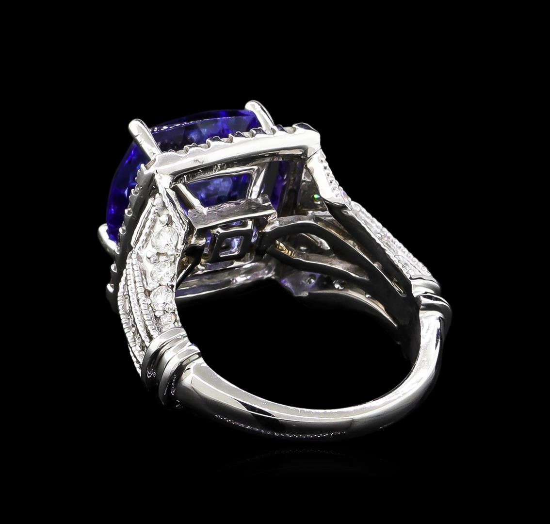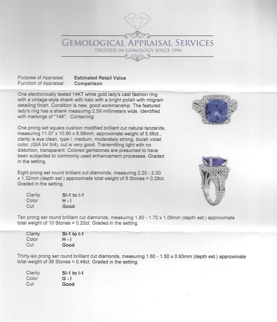 One electronically tested 14KT white gold lady's cast fashion ring with a vintage-style shank with halo with a bright polish with milgrain detailing finish. The featured lady's ring has a shank measuring 2.59 millimeters wide. Identified with markings of "14K". Condition is new, good workmanship. Containing: One prong set square cushion modified brilliant cut natural tanzanite, measuring 11.07 x 10.90 x 6.56mm, approximate weight of 5.56ct., clarity is eye clean, type I, medium, moderately strong, bluish violet color, (GIA bV 5/4), cut is very good. Transmitting light with no distortion, transparent. Colored gemstones are presumed to have been subjected to commonly used enhancement processes. Graded in the setting. Eight prong set round brilliant cut diamonds, measuring 2.20 - 2.00 x 1.32mm (depth est.) approximate total weight of 8 Stones = 0.28ct. Graded in the setting. Clarity: SI-1 to I-1. Color: H - I. Cut Good Ten prong set round brilliant cut diamonds, measuring 1.80 - 1.70 x 1.09mm (depth est.) approximate total weight of 10 Stones = 0.20ct. Graded in the setting. Clarity: SI-1 to I-1. Color: H - I. Cut Good Thirty-Six prong set round brilliant cut diamonds, measuring 1.60 - 1.50 x 0.93mm (depth est.) approximate total weight of 36 Stones = 0.49ct. Graded in the setting. Clarity: SI-1 to I-1. Color: G - I. Cut Good Four prong set round brilliant cut diamonds, measuring 1.20 - 1.10 x 0.72mm (depth est.) approximate total weight of 4 Stones = 0.02ct. Graded in the setting. Clarity: SI-1 to SI-2. Color: H - I. Cut Good. Total Weight of Colored Stones 5.56ct. Total Weight of Diamonds 0.99ct. Total Weight of Ring 8.50 grams. GAS Appraised at $10,575.00.