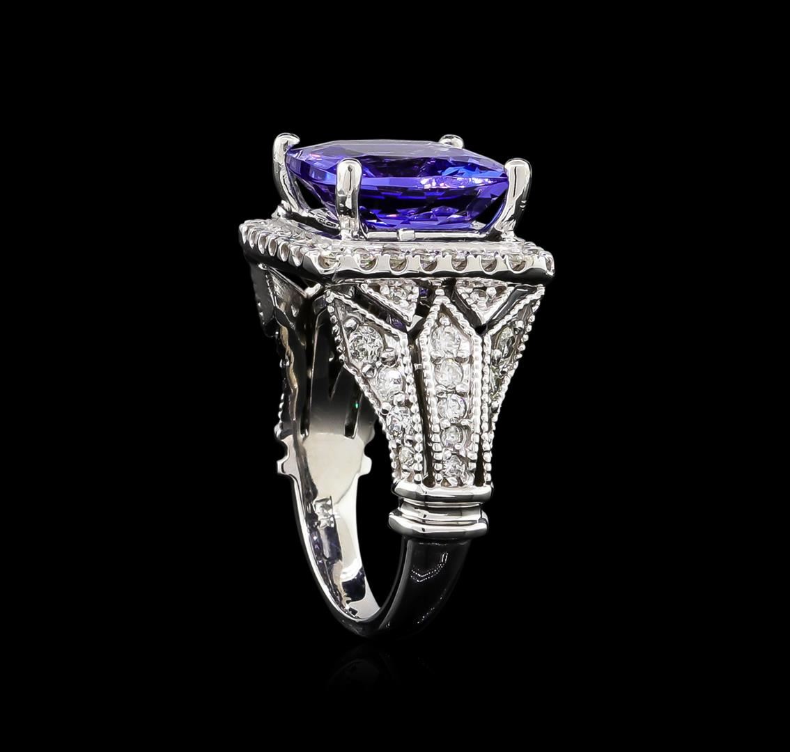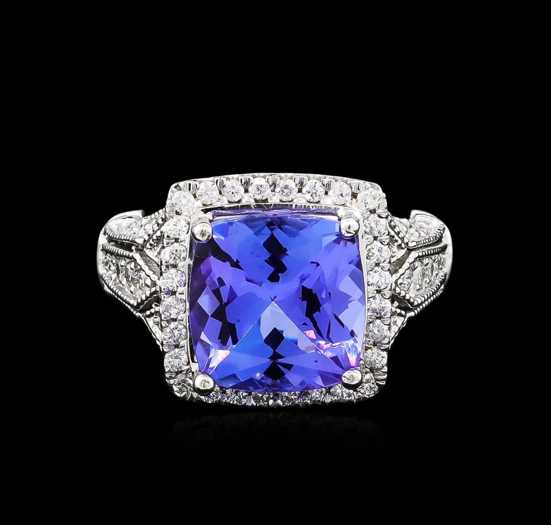 One electronically tested 14KT white gold lady's cast fashion ring with a vintage-style shank with halo with a bright polish with milgrain detailing finish. The featured lady's ring has a shank measuring 2.59 millimeters wide. Identified with markings of "14K". Condition is new, good workmanship. Containing: One prong set square cushion modified brilliant cut natural tanzanite, measuring 11.07 x 10.90 x 6.56mm, approximate weight of 5.56ct., clarity is eye clean, type I, medium, moderately strong, bluish violet color, (GIA bV 5/4), cut is very good. Transmitting light with no distortion, transparent. Colored gemstones are presumed to have been subjected to commonly used enhancement processes. Graded in the setting. Eight prong set round brilliant cut diamonds, measuring 2.20 - 2.00 x 1.32mm (depth est.) approximate total weight of 8 Stones = 0.28ct. Graded in the setting. Clarity: SI-1 to I-1. Color: H - I. Cut Good Ten prong set round brilliant cut diamonds, measuring 1.80 - 1.70 x 1.09mm (depth est.) approximate total weight of 10 Stones = 0.20ct. Graded in the setting. Clarity: SI-1 to I-1. Color: H - I. Cut Good Thirty-Six prong set round brilliant cut diamonds, measuring 1.60 - 1.50 x 0.93mm (depth est.) approximate total weight of 36 Stones = 0.49ct. Graded in the setting. Clarity: SI-1 to I-1. Color: G - I. Cut Good Four prong set round brilliant cut diamonds, measuring 1.20 - 1.10 x 0.72mm (depth est.) approximate total weight of 4 Stones = 0.02ct. Graded in the setting. Clarity: SI-1 to SI-2. Color: H - I. Cut Good. Total Weight of Colored Stones 5.56ct. Total Weight of Diamonds 0.99ct. Total Weight of Ring 8.50 grams. GAS Appraised at $10,575.00.