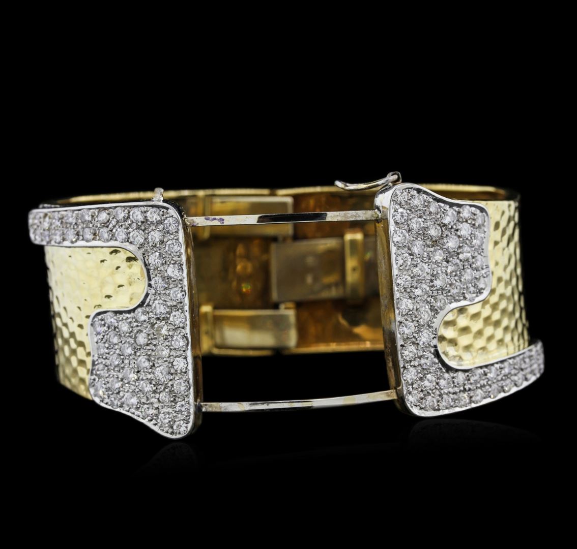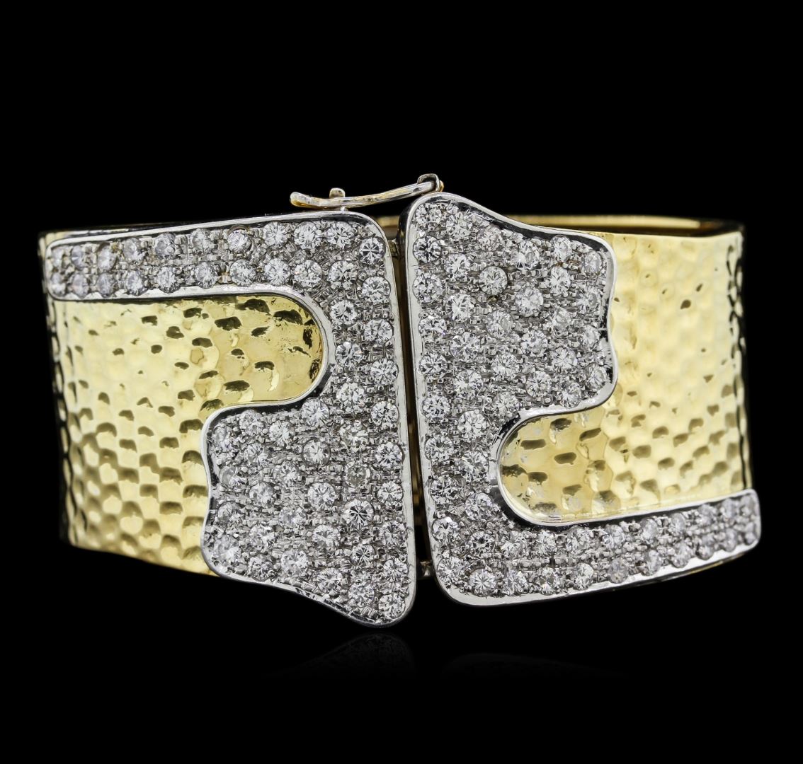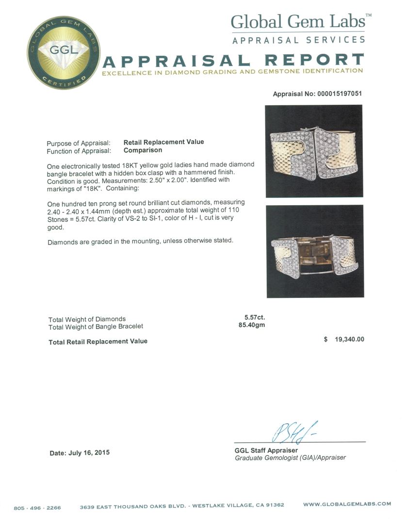 One electronically tested 18KT yellow gold ladies hand made diamond bangle bracelet with a hidden box clasp with a hammered finish. Measurements: 2.50" x 2.00.". Identified with markings of "18K". Condition is good. Containing: One Hundred Ten prong set round brilliant cut diamonds, measuring 2.40 - 2.40 x 1.44mm (depth est.) approximate total weight of 110 Stones = 5.57ct. Clarity: VS-2 to SI-1. Color: H - I, Cut is Very Good. Diamonds are graded in the mounting, unless otherwise stated. Total Weight of Diamonds 5.57ct. Total Weight of Bangle Bracelet 85.40 grams. GGL Appraised at $19,340.00.