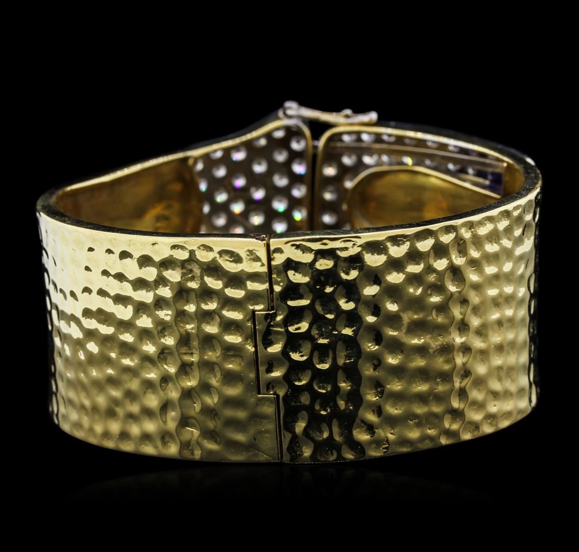 One electronically tested 18KT yellow gold ladies hand made diamond bangle bracelet with a hidden box clasp with a hammered finish. Measurements: 2.50" x 2.00.". Identified with markings of "18K". Condition is good. Containing: One Hundred Ten prong set round brilliant cut diamonds, measuring 2.40 - 2.40 x 1.44mm (depth est.) approximate total weight of 110 Stones = 5.57ct. Clarity: VS-2 to SI-1. Color: H - I, Cut is Very Good. Diamonds are graded in the mounting, unless otherwise stated. Total Weight of Diamonds 5.57ct. Total Weight of Bangle Bracelet 85.40 grams. GGL Appraised at $19,340.00.