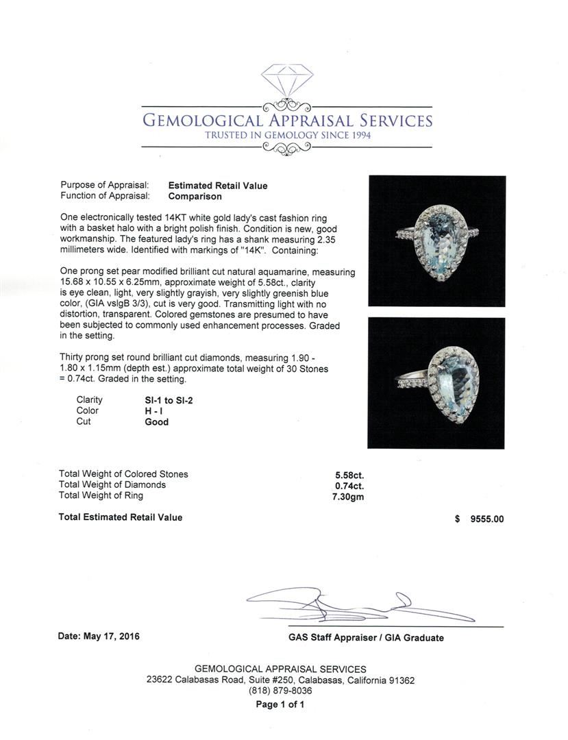 One electronically tested 14KT white gold lady's cast fashion ring with a basket halo with a bright polish finish. The featured lady's ring has a shank measuring 2.35 millimeters wide. Identified with markings of "14K". Condition is new, good workmanship. Containing: One prong set pear modified brilliant cut natural aquamarine, measuring 15.68 x 10.55 x 6.25mm, approximate weight of 5.58ct., clarity is eye clean, light, very slightly grayish, very slightly greenish blue color, (GIA vslgB 3/3), cut is very good. Transmitting light with no distortion, transparent. Colored gemstones are presumed to have been subjected to commonly used enhancement processes. Graded in the setting. Thirty prong set round brilliant cut diamonds, measuring 1.90 - 1.80 x 1.15mm (depth est.) approximate total weight of 30 Stones = 0.74ct. Graded in the setting. Clarity: SI-1 to SI-2. Color: H - I. Cut Good. Total Weight of Colored Stones 5.58ct. Total Weight of Diamonds 0.74ct. Total Weight of Ring 7.30gm. GAS Appraised at $9,555.00.