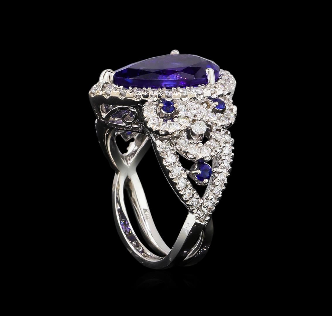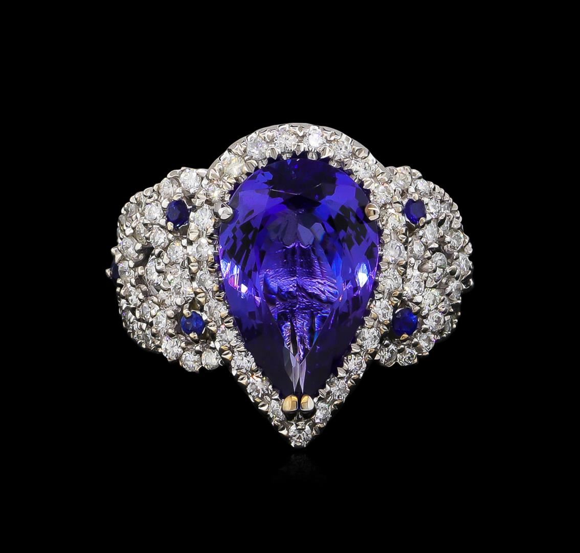 One electronically tested 14KT white gold lady's cast fashion ring with a scalloped split shank halo with a bright polish finish. The featured lady's ring has a double shank measuring 4.67 millimeters wide. Identified with markings of "K14". Condition is new, good workmanship. Containing: One prong set pear modified brilliant cut natural tanzanite, measuring 14.66 x 9.53 x 5.84mm, approximate weight of 5.39ct., clarity is eye clean, type I, medium dark, moderately strong, violetish blue color, (GIA vB 6/4), cut is very good. Transmitting light with no distortion, transparent. Colored gemstones are presumed to have been subjected to commonly used enhancement processes. Graded in the setting. Six prong set round modified brilliant cut natural blue sapphires, measuring 1.90 - 1.80 x 1.21 mm, approximate. Total Weight of 0.19ct., clarity is eye clean, type II, medium dark, moderately strong, blue color, (GIA B 6/4), cut is very good. Transmitting light with no distortion, transparent. Colored gemstones are presumed to have been subjected to commonly used enhancement processes. Graded in the setting. Eighty-Nine prong set round brilliant cut diamonds, measuring 1.45 - 1.35 x 0.88mm (depth est.) approximate. Total Weight of 89 Stones = 0.96ct. Graded in the setting. Clarity: SI-1 to SI-2. Color: H - I. Cut Good. Total Weight of Colored Stones 5.58ct. Total Weight of Diamonds 0.96ct. Total Weight of Ring 10.10gm. GAS Appraised at $13,740.00.