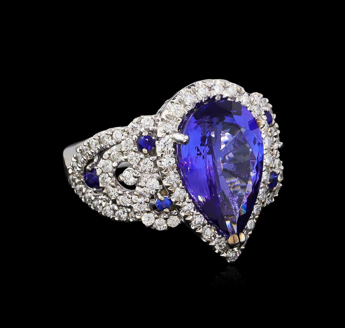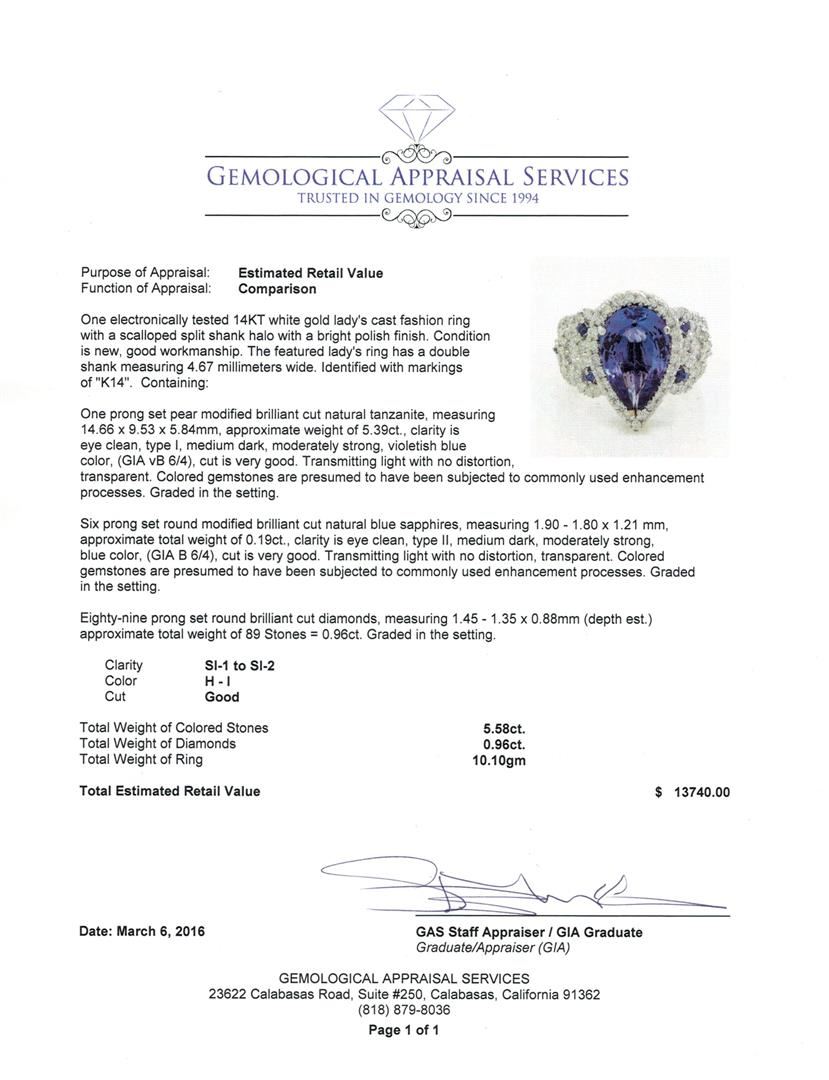 One electronically tested 14KT white gold lady's cast fashion ring with a scalloped split shank halo with a bright polish finish. The featured lady's ring has a double shank measuring 4.67 millimeters wide. Identified with markings of "K14". Condition is new, good workmanship. Containing: One prong set pear modified brilliant cut natural tanzanite, measuring 14.66 x 9.53 x 5.84mm, approximate weight of 5.39ct., clarity is eye clean, type I, medium dark, moderately strong, violetish blue color, (GIA vB 6/4), cut is very good. Transmitting light with no distortion, transparent. Colored gemstones are presumed to have been subjected to commonly used enhancement processes. Graded in the setting. Six prong set round modified brilliant cut natural blue sapphires, measuring 1.90 - 1.80 x 1.21 mm, approximate. Total Weight of 0.19ct., clarity is eye clean, type II, medium dark, moderately strong, blue color, (GIA B 6/4), cut is very good. Transmitting light with no distortion, transparent. Colored gemstones are presumed to have been subjected to commonly used enhancement processes. Graded in the setting. Eighty-Nine prong set round brilliant cut diamonds, measuring 1.45 - 1.35 x 0.88mm (depth est.) approximate. Total Weight of 89 Stones = 0.96ct. Graded in the setting. Clarity: SI-1 to SI-2. Color: H - I. Cut Good. Total Weight of Colored Stones 5.58ct. Total Weight of Diamonds 0.96ct. Total Weight of Ring 10.10gm. GAS Appraised at $13,740.00.