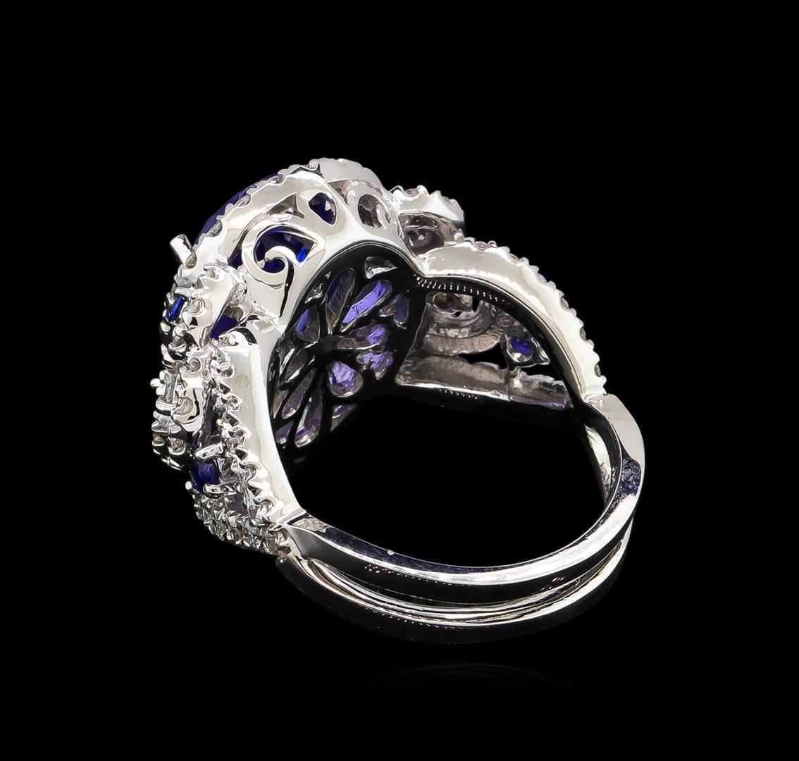 One electronically tested 14KT white gold lady's cast fashion ring with a scalloped split shank halo with a bright polish finish. The featured lady's ring has a double shank measuring 4.67 millimeters wide. Identified with markings of "K14". Condition is new, good workmanship. Containing: One prong set pear modified brilliant cut natural tanzanite, measuring 14.66 x 9.53 x 5.84mm, approximate weight of 5.39ct., clarity is eye clean, type I, medium dark, moderately strong, violetish blue color, (GIA vB 6/4), cut is very good. Transmitting light with no distortion, transparent. Colored gemstones are presumed to have been subjected to commonly used enhancement processes. Graded in the setting. Six prong set round modified brilliant cut natural blue sapphires, measuring 1.90 - 1.80 x 1.21 mm, approximate. Total Weight of 0.19ct., clarity is eye clean, type II, medium dark, moderately strong, blue color, (GIA B 6/4), cut is very good. Transmitting light with no distortion, transparent. Colored gemstones are presumed to have been subjected to commonly used enhancement processes. Graded in the setting. Eighty-Nine prong set round brilliant cut diamonds, measuring 1.45 - 1.35 x 0.88mm (depth est.) approximate. Total Weight of 89 Stones = 0.96ct. Graded in the setting. Clarity: SI-1 to SI-2. Color: H - I. Cut Good. Total Weight of Colored Stones 5.58ct. Total Weight of Diamonds 0.96ct. Total Weight of Ring 10.10gm. GAS Appraised at $13,740.00.