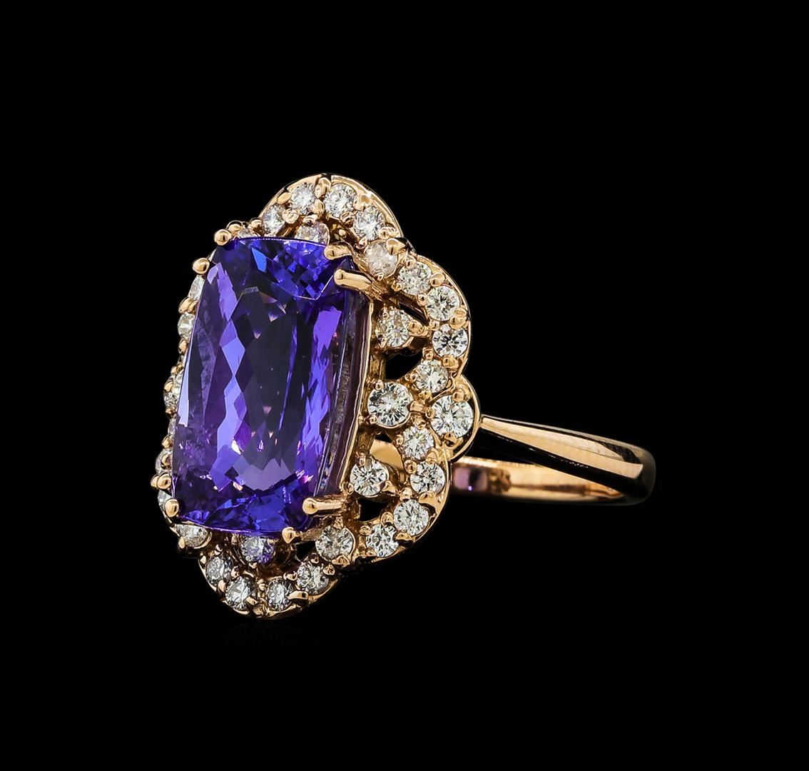 One electronically tested 14KT rose gold lady's cast fashion ring with a scalloped basket halo with a bright polish finish. The featured lady's ring has a shank measuring 1.76 millimeters wide. Identified with markings of 'K14'. Condition is new, good workmanship. Containing: One prong set rectangular cushion modified brilliant cut natural tanzanite, measuring 13.18 x 7.83 x 6.17mm, (depth est.) 11%. bulge factor, approximate weight of 5.58ct., clarity is eye clean, medium dark, moderately strong, violetish blue color, (GIA vB 6/4), cut is very good. Transmitting light with no distortion, transparent. Colored gemstones are presumed to have been subjected to commonly used enhancement processes. Graded in the setting. Four prong set round brilliant cut diamonds, measuring 2.05 - 1.95 x 1.24mm (depth est.) approximate total weight of 4 Stones = 0.12ct. Graded in the setting. Clarity SI-1 to SI-2. Color: H - I Cut Good Ten prong set round brilliant cut diamonds, measuring 1.70 - 1.60 x 1.02mm (depth est.) approximate total weight of 10 Stones = 0.17ct. Graded in the setting. Clarity SI-1 to I-1. Color: H - I Cut Good Twenty-Four prong set round brilliant cut diamonds, measuring 1.60 - 1.50 x 0.96mm (depth est.) approximate total weight of 24 Stones = 0.34ct. Graded in the setting. Clarity SI-1 to SI-2. Color: H - I Cut Good. Total Weight of Colored Stones 5.58ct.. Total Weight of Diamonds 0.63ct.. Total Weight of Ring 6.40gm GAS Appraised at $12,130.00.