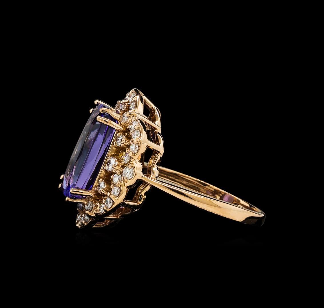 One electronically tested 14KT rose gold lady's cast fashion ring with a scalloped basket halo with a bright polish finish. The featured lady's ring has a shank measuring 1.76 millimeters wide. Identified with markings of 'K14'. Condition is new, good workmanship. Containing: One prong set rectangular cushion modified brilliant cut natural tanzanite, measuring 13.18 x 7.83 x 6.17mm, (depth est.) 11%. bulge factor, approximate weight of 5.58ct., clarity is eye clean, medium dark, moderately strong, violetish blue color, (GIA vB 6/4), cut is very good. Transmitting light with no distortion, transparent. Colored gemstones are presumed to have been subjected to commonly used enhancement processes. Graded in the setting. Four prong set round brilliant cut diamonds, measuring 2.05 - 1.95 x 1.24mm (depth est.) approximate total weight of 4 Stones = 0.12ct. Graded in the setting. Clarity SI-1 to SI-2. Color: H - I Cut Good Ten prong set round brilliant cut diamonds, measuring 1.70 - 1.60 x 1.02mm (depth est.) approximate total weight of 10 Stones = 0.17ct. Graded in the setting. Clarity SI-1 to I-1. Color: H - I Cut Good Twenty-Four prong set round brilliant cut diamonds, measuring 1.60 - 1.50 x 0.96mm (depth est.) approximate total weight of 24 Stones = 0.34ct. Graded in the setting. Clarity SI-1 to SI-2. Color: H - I Cut Good. Total Weight of Colored Stones 5.58ct.. Total Weight of Diamonds 0.63ct.. Total Weight of Ring 6.40gm GAS Appraised at $12,130.00.