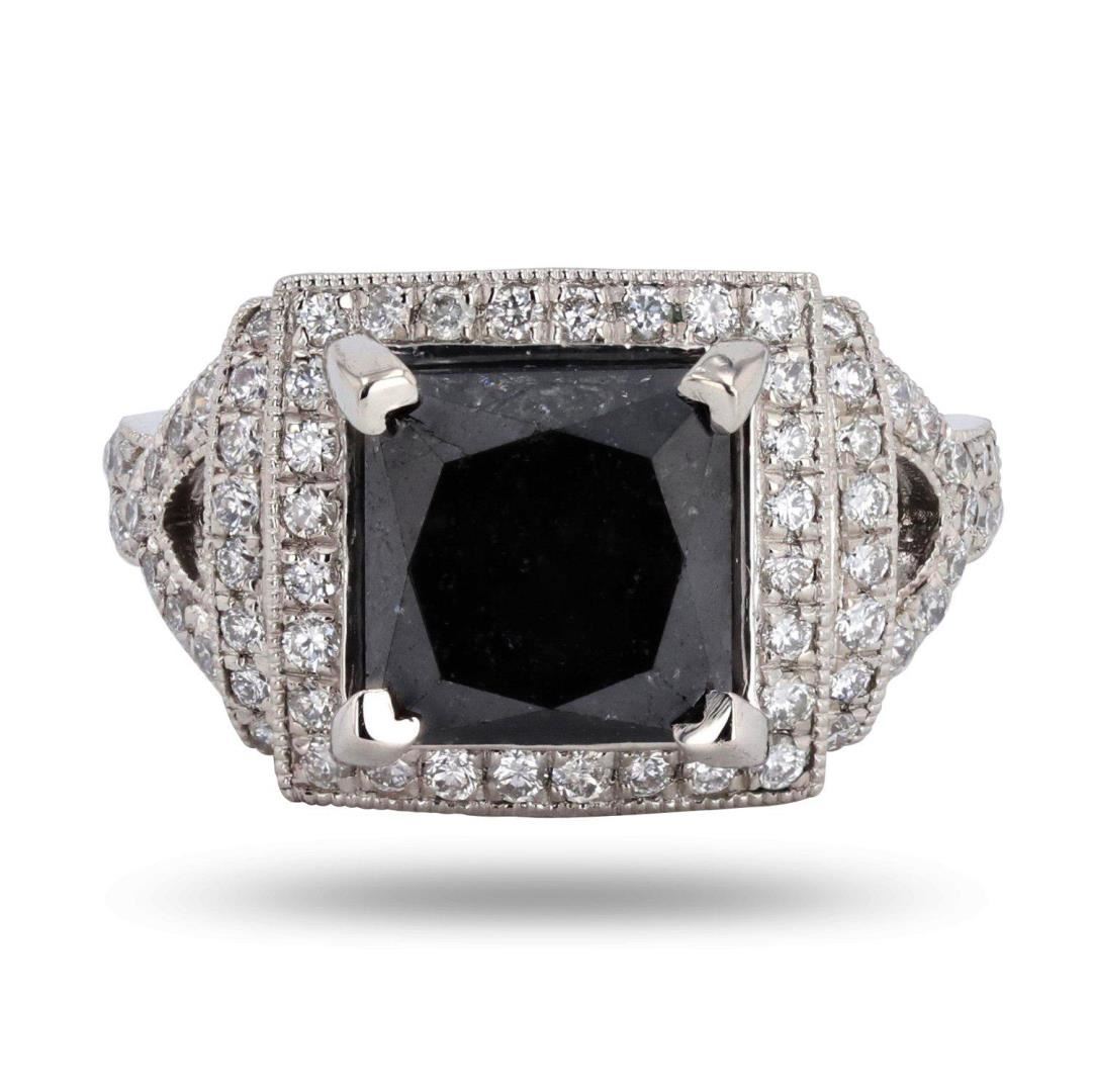 One polished, stamped, and tested platinum ring with a bright finish. The ring is mounted with 1 genuine black diamond center stone weighing approximately 5.59 carat, and 74 genuine faceted diamonds weighing approximately 0.69 carats. This item weighs 10.6 grams, condition is new, excellent workmanship. MAIN GEMSTONE Identity: Natural Diamond Shape: Square Cutting Style: Modified Brilliant Cut Measurements: 8.6 x 8.4 x 7.9mm Weight: 5.59 carat Color: Black Cut Grade: Good Transparency: Opaque Refractive Index: 2.417 Hardness: 10 ADJACENT GEMSTONES ON RING Identity: Natural Diamond Shape: Round Cutting Style: Brilliant Cut Quantity: 74 Diamonds Measurements: 1.0 - 1.3mm Total Weight: 0.69 carats Color tirade: G - H Clarity Grade: VS2 to SI1 Refractive Index: 2.418 Hardness: 10 BLACK DIAMOND WEIGHT: 5.59ct TOTAL DIAMOND WEIGHT: 6.28ctw WEIGHT OF ITEM: 10.6 grams METAL: Platinum