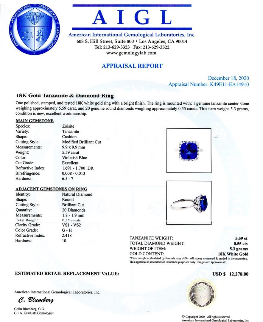 5.59ct Tanzanite and 0.55ctw Diamond 18K White Gold Ring. Please see Photos and Description for all available information. This cushion modified brilliant cut 5.59ct Tanzanite is accented with 20 diamonds with a total weight of 0.55ct, set in an 18K white gold band. The Tanzanite is the birthstone for December. The cushion modified brilliant cut allows the stone to catch and reflect light, giving it a high level of brilliance. The modified brilliant cut is a square modified brilliant cut with a rounded corner. The ring comes in size 6 1/4 and can be resized