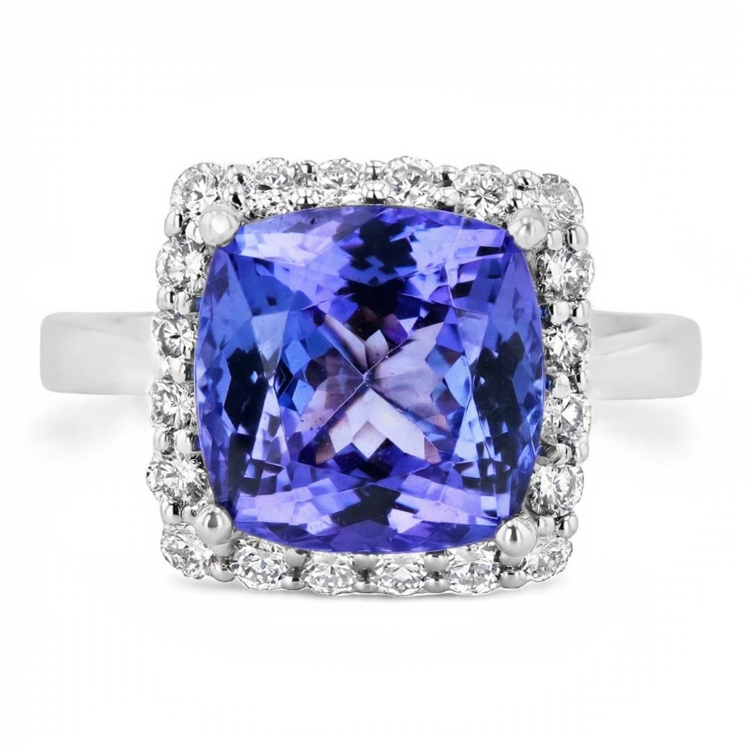 5.59ct Tanzanite and 0.55ctw Diamond 18K White Gold Ring. Please see Photos and Description for all available information. This cushion modified brilliant cut 5.59ct Tanzanite is accented with 20 diamonds with a total weight of 0.55ct, set in an 18K white gold band. The Tanzanite is the birthstone for December. The cushion modified brilliant cut allows the stone to catch and reflect light, giving it a high level of brilliance. The modified brilliant cut is a square modified brilliant cut with a rounded corner. The ring comes in size 6 1/4 and can be resized