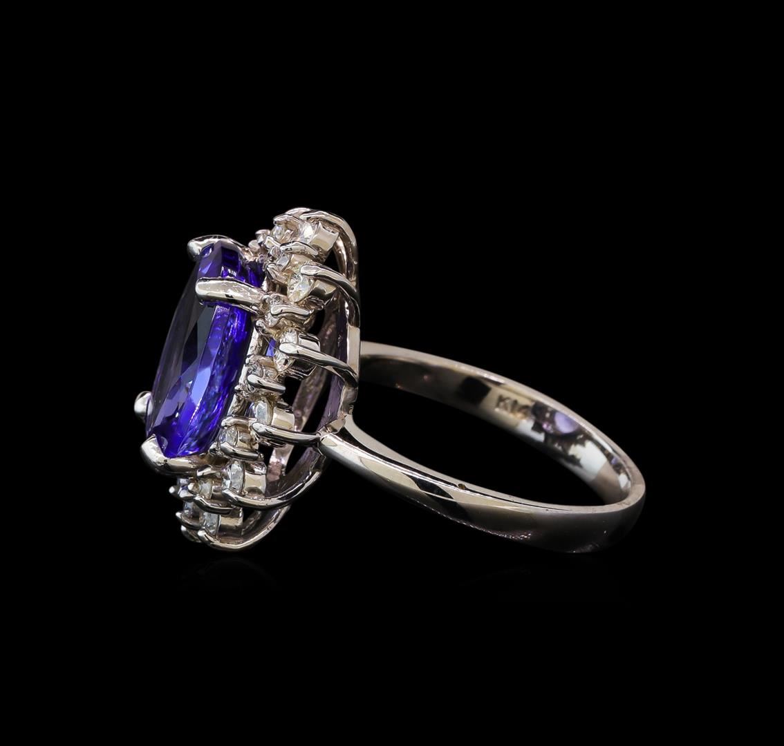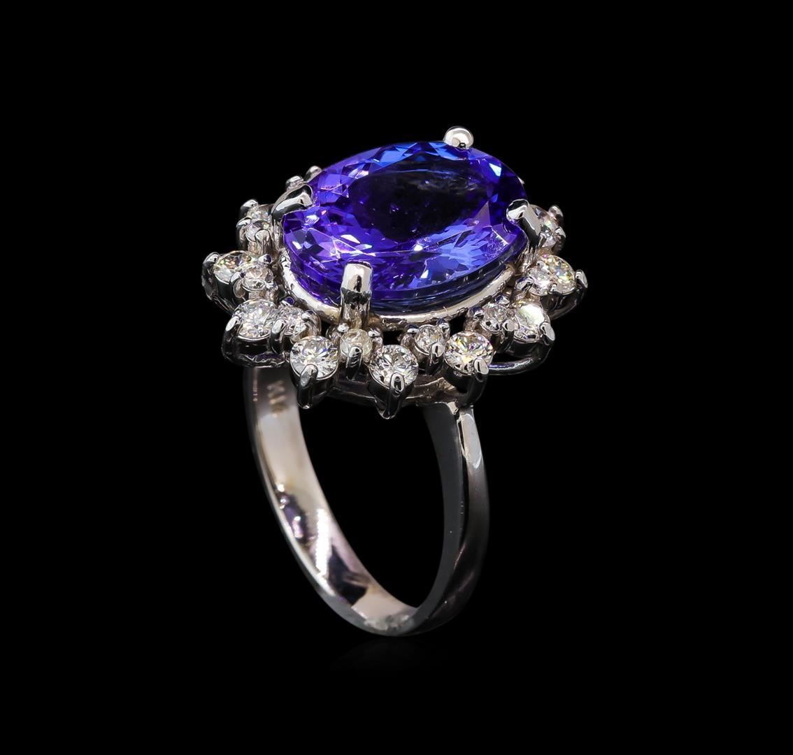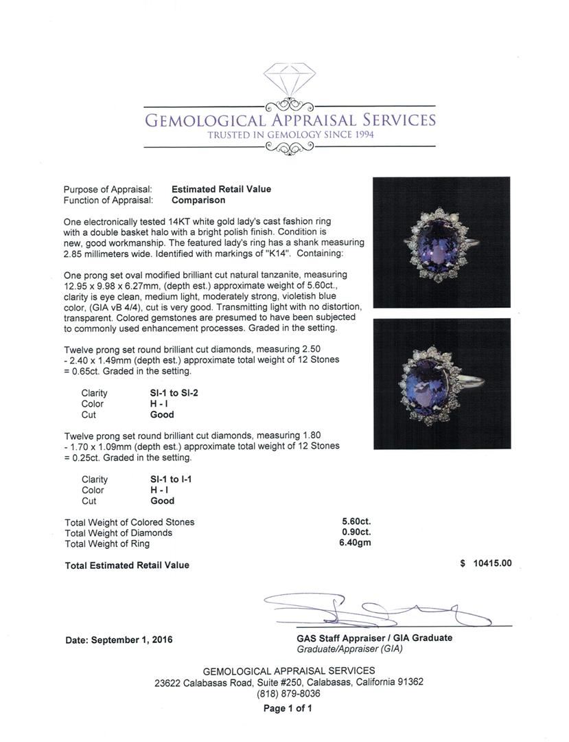 One electronically tested 14KT white gold lady's cast fashion ring with a double basket halo with a bright polish finish. The featured lady's ring has a shank measuring 2.85 millimeters wide. Identified with markings of 'K14'. Condition is new, good workmanship. Containing: One prong set oval modified brilliant cut natural tanzanite, measuring 12.95 x 9.98 x 6.27mm, (depth est.) approximate weight of 5.60ct., clarity is eye clean, medium light, moderately strong, violetish blue color, (GIA vB 4/4), cut is very good. Transmitting light with no distortion, transparent. Colored gemstones are presumed to have been subjected to commonly used enhancement processes. Graded in the setting. Twelve prong set round brilliant cut diamonds, measuring 2.50 - 2.40 x 1.49mm (depth est.) approximate total weight of 12 Stones = 0.65ct. Graded in the setting. Clarity SI-1 to SI-2. Color: H - I Cut Good Twelve prong set round brilliant cut diamonds, measuring 1.80 - 1.70 x 1.09mm (depth est.) approximate total weight of 12 Stones = 0.25ct. Graded in the setting. Clarity SI-1 to I-1. Color: H - I Cut Good. Total Weight of Colored Stones 5.60ct.. Total Weight of Diamonds 0.90ct.. Total Weight of Ring 6.40gm GAS Appraised at $10,415.00.