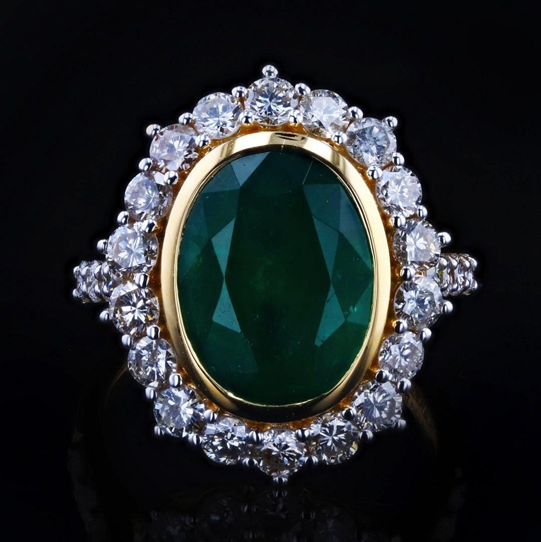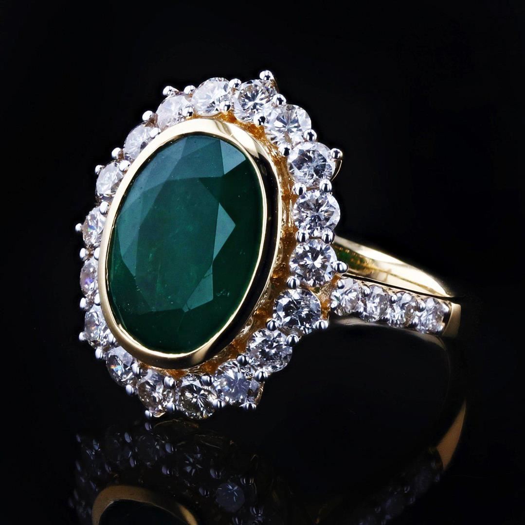 5.62ct Emerald and 1.77ctw Diamond 18K Yellow Gold Ring. One Oscar Friedman 18K Yellow Gold Emerald & Diamond Ring Weight: 7.06 grams One Oval Cut Natural Emerald Approx. Measurements: 12.80 x 10.00 x 7.28mm Weight: 5.62 carats Color: Green Transparency: Transparent to Semi-Transparent Treatment: Significant (F3) Twenty-Six Round Brilliant Cut Diamonds Total Weight: 1.77 carats Average Color: H-J Average Clarity: SI1-SI3 Setting Style: Prong