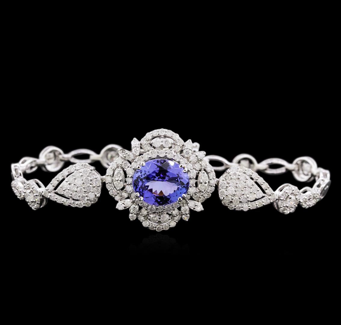 One electronically tested 14KT white gold ladies cast & assembled tanzanite and diamond bracelet. Seven inch length bracelet features a stylized tanzanite and diamond center supported by an elaborate diamond ribbon transitioning into matching white gold links, terminating in a concealed clasp with twin safeties. Bright polish finish. Trademark is Orianne. Identified with markings of "14K". Condition is new, good workmanship. Containing: One prong set oval mixed cut natural tanzanite, measuring 11.85 x 9.75 x 6.40mm, 6%. bulge factor, approximate weight of 5.62ct., clarity is eye clean, type I, medium dark, very slightly grayish, bluish violet color, (GIA bV 6/3), cut is good. Transmitting light with no distortion, transparent. Colored Stone Grading Report attached. Graded in the setting. Tanzanite is a very rare gemstone that is only found in the country of Tanzania. Originally discovered in 1967. Tiffany & Company, named the stone Tanzanite. It is found in the Usumburu Mountains that border the Umba Valley of northern Tanzania. Tanzanite occurs in gray, brown, violet, blue, reddish-purple, & green. The gem is interesting because of its exceptional pleochroism. Rotated in different directions a tanzanite will exhibit multiple changes of color. Tanzanite has a low tolerance to ultrasonic cleaning, and should not be cleaned using this method. One Hundred Eighty-Eight prong set round brilliant cut diamonds approximate total weight of 188 Stones = 3.27ct. Graded in the setting. Clarity: SI-2 to I-1. Color: G - I. Total Weight of Colored Stones 5.62ct. Total Weight of Diamonds 3.27ct. Total Weight of Bracelet 12.90gm. AIG Appraised at $23,685.00.