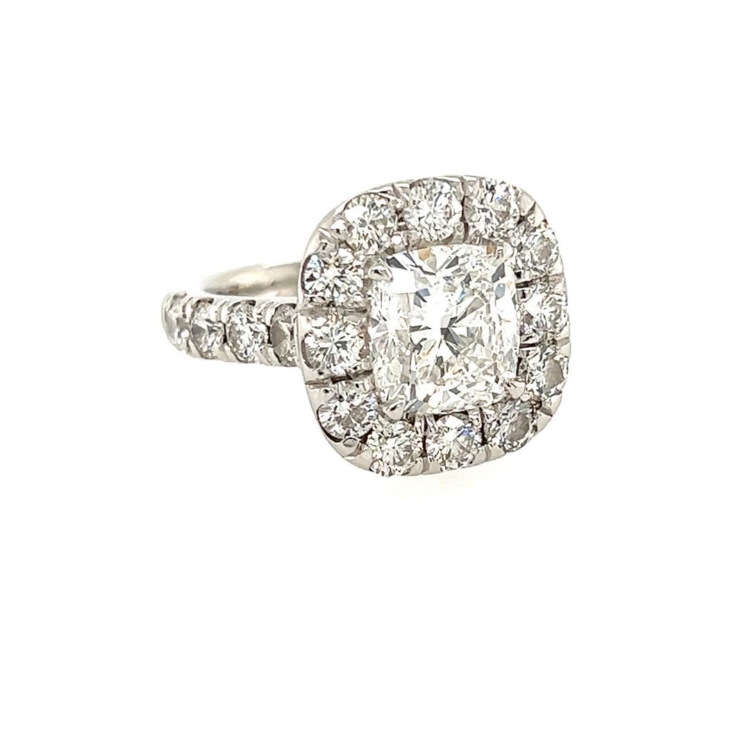 One electronically tested platinum lady's combination cast & assembled wedding ring with a halo motif with a bright polish finish. Condition is like new, good workmanship. The featured lady's ring has a shank measuring 3.50mm in width Containing: One prong set cushion cut diamond, measuring 8.93 x 8.36 x 5.69mm (depth est.) approximate weight of 3.20ct with a medium blue fluorescence. Graded loose prior to setting in the GIA Laboratory, Report #6222298598. Laser inscribed. Color E Clarity SI-2 Cut Excellent Eight prong set round brilliant cut diamonds, measuring 3.30 - 3.15 x 2.00mm (depth est.) approximate total weight of 8 Stones = 1.01ct. Graded in the setting. Color G-H Clarity VS-2 to SI-1 Cut Very Good Twelve prong set round brilliant cut diamonds, measuring 3.20 - 3.10 x 1.95mm (depth est.) approximate total weight of 12 Stones = 1.42ct. Graded in the setting. Color G-H Clarity VS-2 to SI-1 Cut Very Good Total Weight of Diamonds 5.63ct. Total Weight of Ring 15.80gm Total Estimated Retail Value $ 123750.00