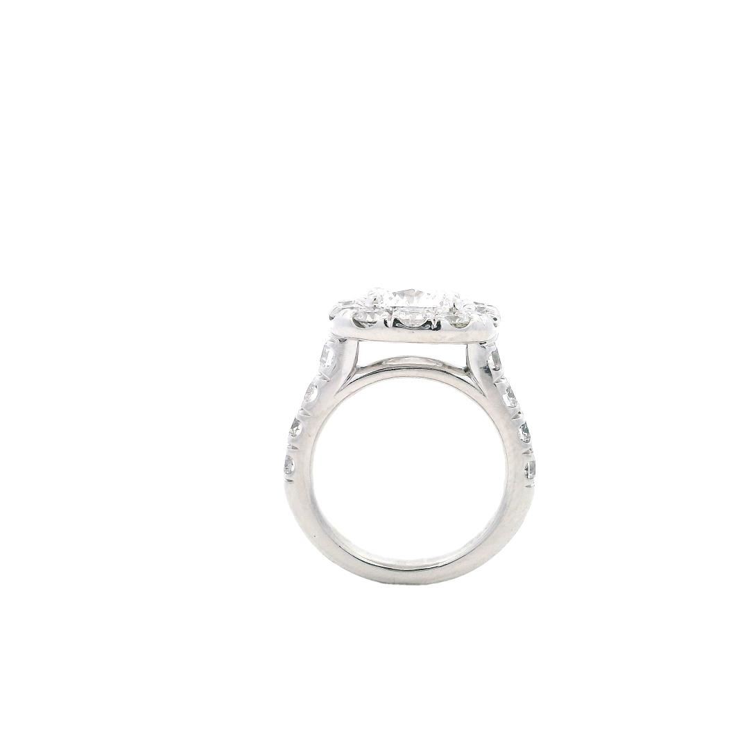 One electronically tested platinum lady's combination cast & assembled wedding ring with a halo motif with a bright polish finish. Conditionis like new, good workmanship. The featured lady's ring has a shankmeasuring 3.50mm in width Containing: One prong set cushion cut diamond, measuring 8.93 x 8.36 x 5.69mm(depth est.) approximate weight of 3.20ct with a medium blue fluorescence.Graded loose prior to setting in the GIA Laboratory, Report #6222298598.Laser inscribed.Color EClarity SI-2Cut ExcellentEight prong set round brilliant cut diamonds, measuring 3.30 - 3.15x 2.00mm (depth est.) approximate total weight of 8 Stones = 1.01ct.Graded in the setting. Color G-HClarity VS-2 to SI-1Cut Very GoodTwelve prong set round brilliant cut diamonds, measuring 3.20- 3.10 x 1.95mm (depth est.) approximate total weight of 12 Stones= 1.42ct. Graded in the setting.Color G-HClarity VS-2 to SI-1Cut Very GoodTotal Weight of Diamonds 5.63ct.Total Weight of Ring 15.80gmTotal Estimated Retail Value $ 123750.00
