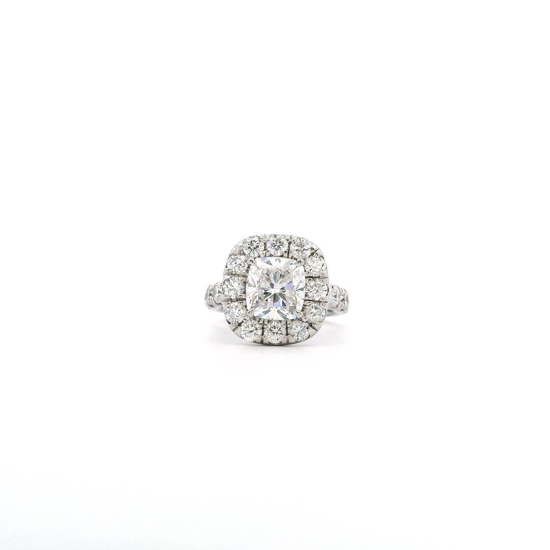 One electronically tested platinum lady's combination cast & assembled wedding ring with a halo motif with a bright polish finish. Conditionis like new, good workmanship. The featured lady's ring has a shankmeasuring 3.50mm in width Containing: One prong set cushion cut diamond, measuring 8.93 x 8.36 x 5.69mm(depth est.) approximate weight of 3.20ct with a medium blue fluorescence.Graded loose prior to setting in the GIA Laboratory, Report #6222298598.Laser inscribed.Color EClarity SI-2Cut ExcellentEight prong set round brilliant cut diamonds, measuring 3.30 - 3.15x 2.00mm (depth est.) approximate total weight of 8 Stones = 1.01ct.Graded in the setting. Color G-HClarity VS-2 to SI-1Cut Very GoodTwelve prong set round brilliant cut diamonds, measuring 3.20- 3.10 x 1.95mm (depth est.) approximate total weight of 12 Stones= 1.42ct. Graded in the setting.Color G-HClarity VS-2 to SI-1Cut Very GoodTotal Weight of Diamonds 5.63ct.Total Weight of Ring 15.80gmTotal Estimated Retail Value $ 123750.00