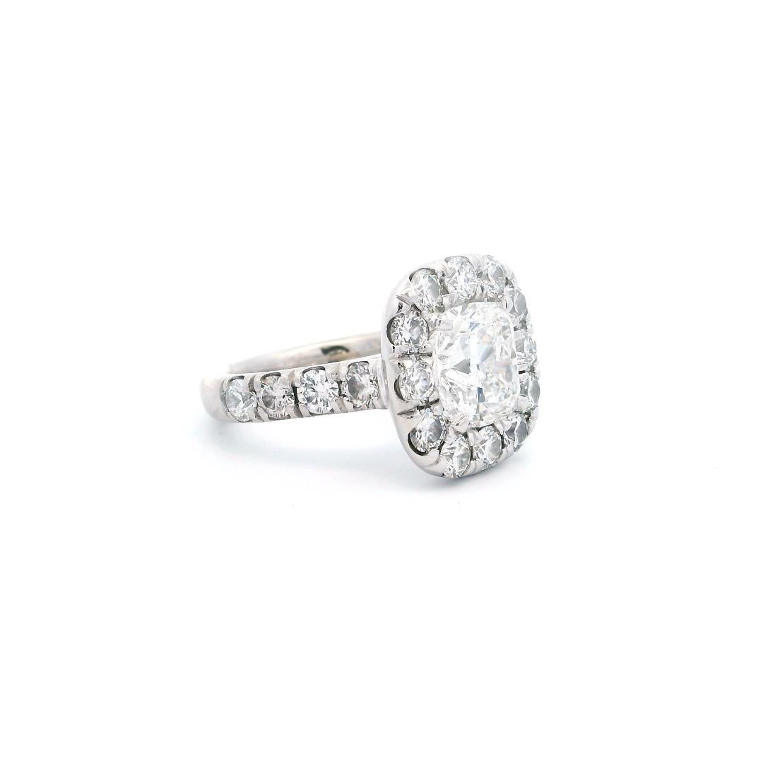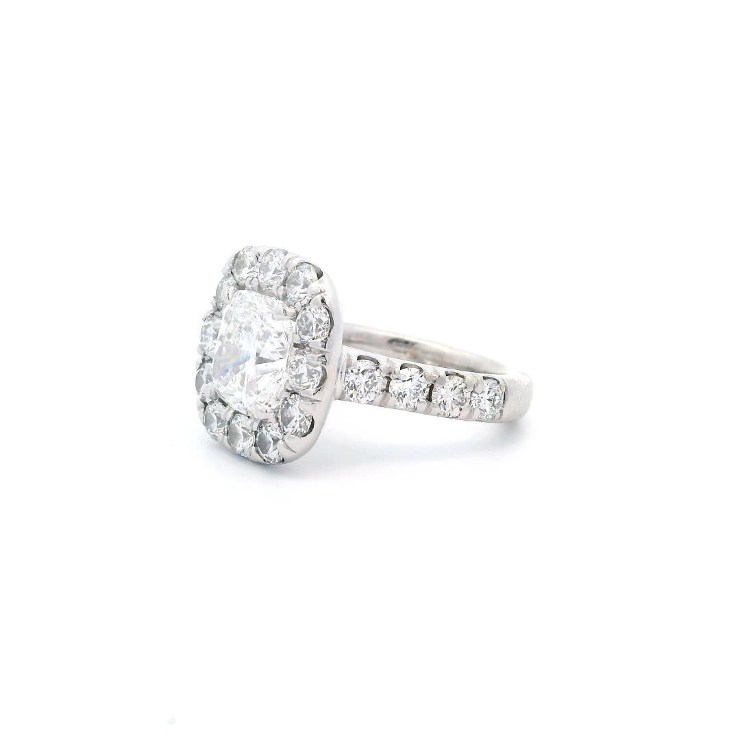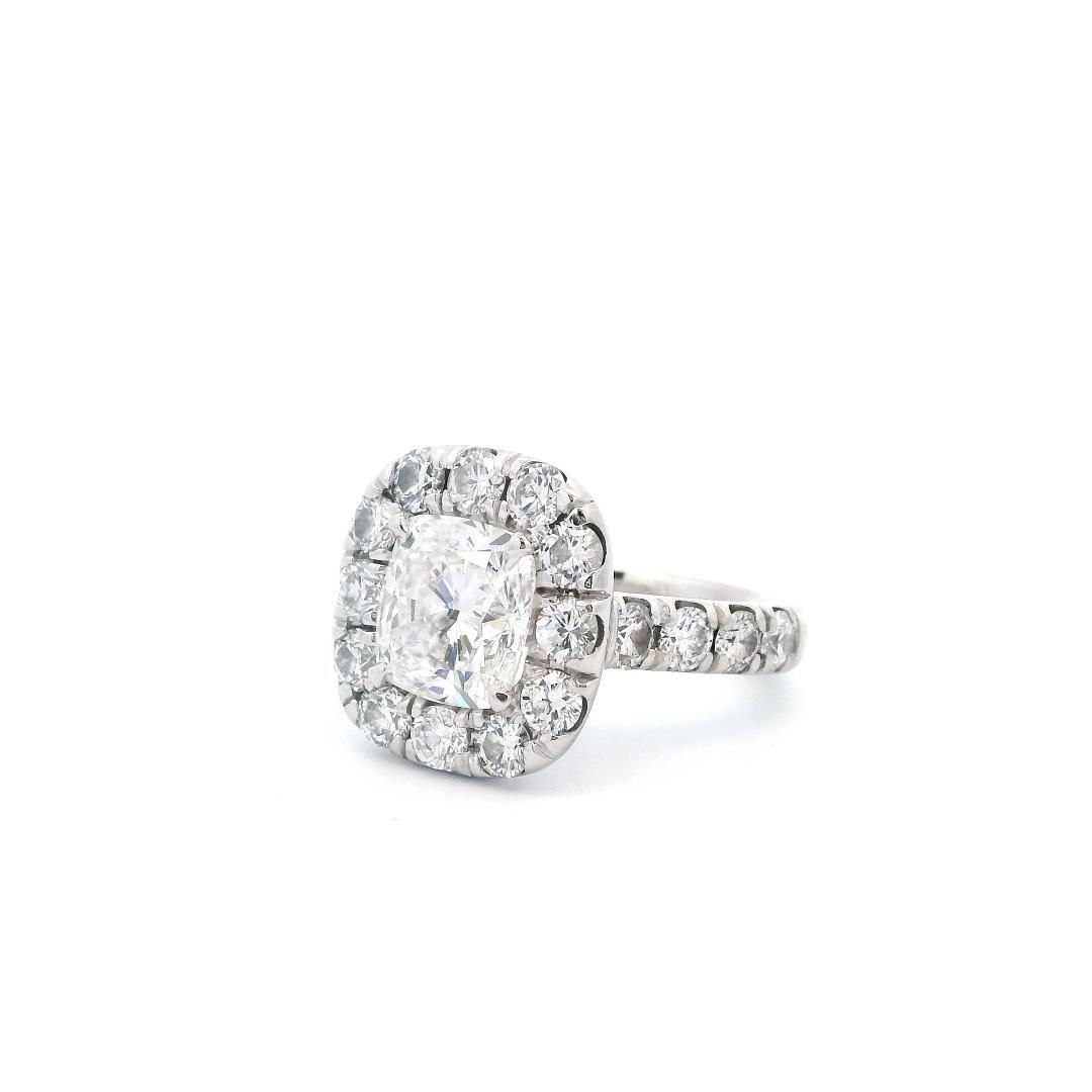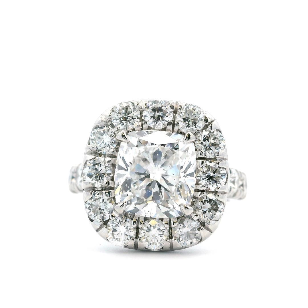 One electronically tested platinum lady's combination cast & assembled wedding ring with a halo motif with a bright polish finish. Conditionis like new, good workmanship. The featured lady's ring has a shankmeasuring 3.50mm in width Containing: One prong set cushion cut diamond, measuring 8.93 x 8.36 x 5.69mm(depth est.) approximate weight of 3.20ct with a medium blue fluorescence.Graded loose prior to setting in the GIA Laboratory, Report #6222298598.Laser inscribed.Color EClarity SI-2Cut ExcellentEight prong set round brilliant cut diamonds, measuring 3.30 - 3.15x 2.00mm (depth est.) approximate total weight of 8 Stones = 1.01ct.Graded in the setting. Color G-HClarity VS-2 to SI-1Cut Very GoodTwelve prong set round brilliant cut diamonds, measuring 3.20- 3.10 x 1.95mm (depth est.) approximate total weight of 12 Stones= 1.42ct. Graded in the setting.Color G-HClarity VS-2 to SI-1Cut Very GoodTotal Weight of Diamonds 5.63ct.Total Weight of Ring 15.80gmTotal Estimated Retail Value $ 123750.00