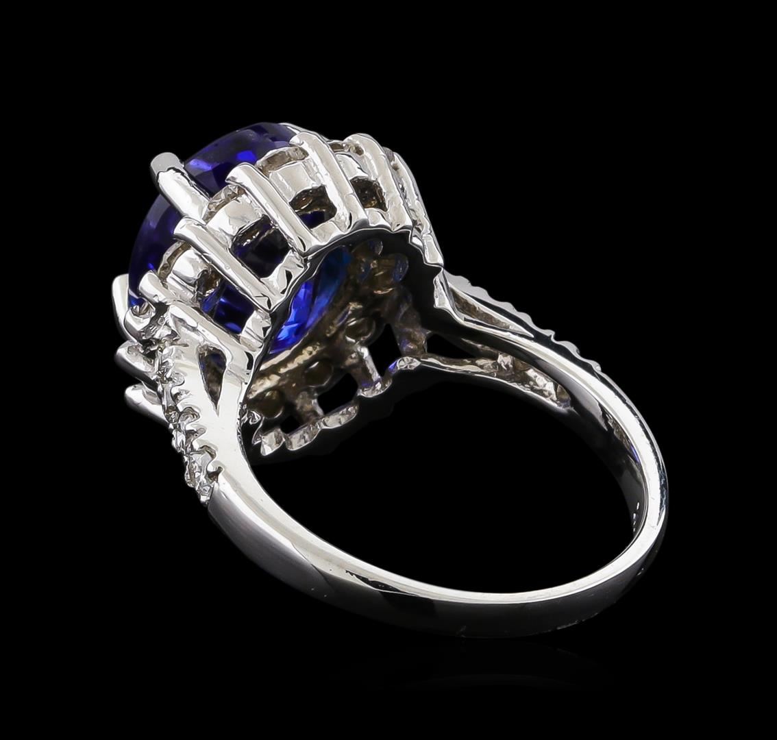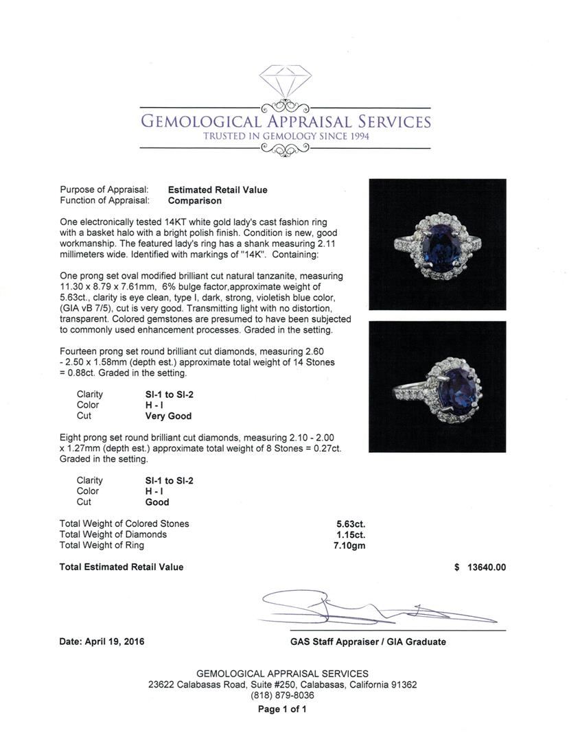 One electronically tested 14KT white gold lady's cast fashion ring with a basket halo with a bright polish finish. The featured lady's ring has a shank measuring 2.11 millimeters wide. Identified with markings of "14K". Condition is new, good workmanship. Containing: One prong set oval modified brilliant cut natural tanzanite, measuring 11.30 x 8.79 x 7.61mm, 6%. bulge factor, approximate weight of 5.63ct., clarity is eye clean, type I, dark, strong, violetish blue color, (GIA vB 7/5), cut is very good. Transmitting light with no distortion, transparent. Colored gemstones are presumed to have been subjected to commonly used enhancement processes. Graded in the setting. Fourteen prong set round brilliant cut diamonds, measuring 2.60 - 2.50 x 1.58mm (depth est.) approximate total weight of 14 Stones = 0.88ct. Graded in the setting. Clarity: SI-1 to SI-2. Color: H - I. Cut Very Good Eight prong set round brilliant cut diamonds, measuring 2.10 - 2.00 x 1.27mm (depth est.) approximate total weight of 8 Stones = 0.27ct. Graded in the setting. Clarity: SI-1 to SI-2. Color: H - I. Cut Good. Total Weight of Colored Stones 5.63ct. Total Weight of Diamonds 1.15ct. Total Weight of Ring 7.10gm. GAS Appraised at $13,640.00.
