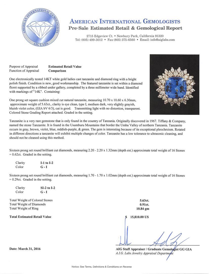 One electronically tested 14KT white gold ladies cast tanzanite and diamond ring with a bright polish finish. The featured tanzanite is set within a diamond floret supported by a ribbed under gallery, completed by a three millimeter wide band. Identified with markings of "14K". Condition is new, good workmanship. Containing: One prong set square cushion mixed cut natural tanzanite, measuring 10.70 x 10.60 x 6.30mm, approximate weight of 5.63ct., clarity is eye clean, type I, medium dark, very slightly grayish, bluish violet color, (GIA bV 6/3), cut is good. Transmitting light with no distortion, transparent. Colored Stone Grading Report attached. Graded in the setting. Tanzanite is a very rare gemstone that is only found in the country of Tanzania. Originally discovered in 1967. Tiffany & Company, named the stone Tanzanite. It is found in the Usumburu Mountains that border the Umba Valley of northern Tanzania. Tanzanite occurs in gray, brown, violet, blue, reddish-purple, & green. The gem is interesting because of its exceptional pleochroism. Rotated in different directions a tanzanite will exhibit multiple changes of color. Tanzanite has a low tolerance to ultrasonic cleaning, and should not be cleaned using this method. Sixteen prong set round brilliant cut diamonds, measuring 2.20 - 2.20 x 1.32mm (depth est.) approximate total weight of 16 Stones = 0.62ct. Graded in the setting. Clarity: I-1 to I-2. Color: G - I Sixteen prong set round brilliant cut diamonds, measuring 1.70 - 1.70 x 1.02mm (depth est.) approximate total weight of 16 Stones = 0.29ct. Graded in the setting. Clarity: SI-2 to I-2. Color: G - I. Total Weight of Colored Stones 5.63ct. Total Weight of Diamonds 0.91ct. Total Weight of Ring 10.84gm. AIG Appraised at $15,810.00.