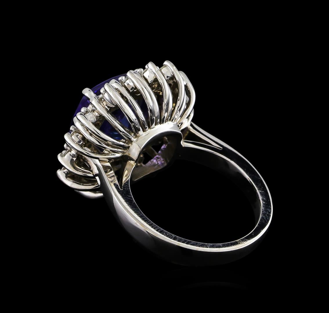 One electronically tested 14KT white gold ladies cast tanzanite and diamond ring with a bright polish finish. The featured tanzanite is set within a diamond floret supported by a ribbed under gallery, completed by a three millimeter wide band. Identified with markings of "14K". Condition is new, good workmanship. Containing: One prong set square cushion mixed cut natural tanzanite, measuring 10.70 x 10.60 x 6.30mm, approximate weight of 5.63ct., clarity is eye clean, type I, medium dark, very slightly grayish, bluish violet color, (GIA bV 6/3), cut is good. Transmitting light with no distortion, transparent. Colored Stone Grading Report attached. Graded in the setting. Tanzanite is a very rare gemstone that is only found in the country of Tanzania. Originally discovered in 1967. Tiffany & Company, named the stone Tanzanite. It is found in the Usumburu Mountains that border the Umba Valley of northern Tanzania. Tanzanite occurs in gray, brown, violet, blue, reddish-purple, & green. The gem is interesting because of its exceptional pleochroism. Rotated in different directions a tanzanite will exhibit multiple changes of color. Tanzanite has a low tolerance to ultrasonic cleaning, and should not be cleaned using this method. Sixteen prong set round brilliant cut diamonds, measuring 2.20 - 2.20 x 1.32mm (depth est.) approximate total weight of 16 Stones = 0.62ct. Graded in the setting. Clarity: I-1 to I-2. Color: G - I Sixteen prong set round brilliant cut diamonds, measuring 1.70 - 1.70 x 1.02mm (depth est.) approximate total weight of 16 Stones = 0.29ct. Graded in the setting. Clarity: SI-2 to I-2. Color: G - I. Total Weight of Colored Stones 5.63ct. Total Weight of Diamonds 0.91ct. Total Weight of Ring 10.84gm. AIG Appraised at $15,810.00.