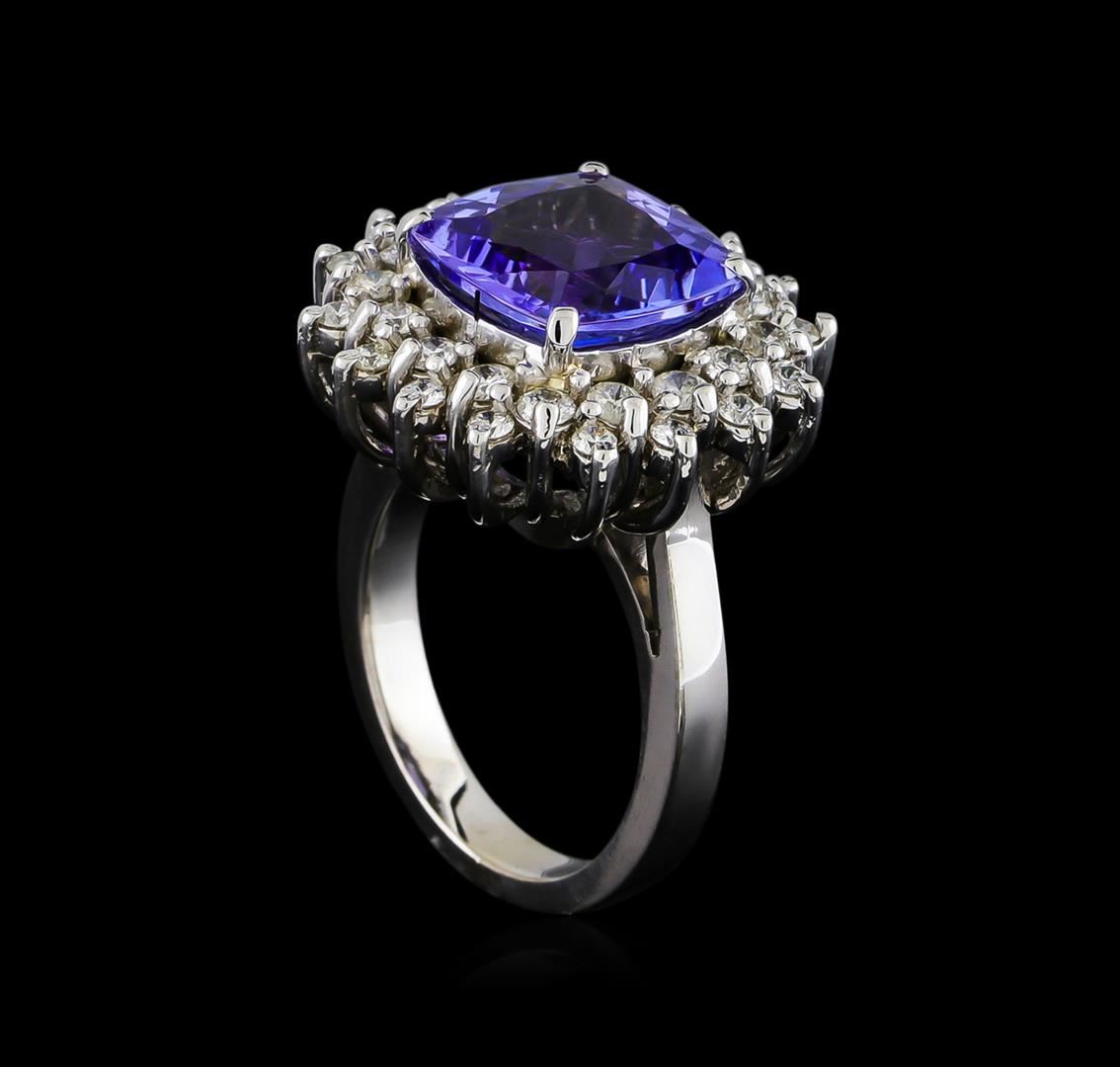 One electronically tested 14KT white gold ladies cast tanzanite and diamond ring with a bright polish finish. The featured tanzanite is set within a diamond floret supported by a ribbed under gallery, completed by a three millimeter wide band. Identified with markings of "14K". Condition is new, good workmanship. Containing: One prong set square cushion mixed cut natural tanzanite, measuring 10.70 x 10.60 x 6.30mm, approximate weight of 5.63ct., clarity is eye clean, type I, medium dark, very slightly grayish, bluish violet color, (GIA bV 6/3), cut is good. Transmitting light with no distortion, transparent. Colored Stone Grading Report attached. Graded in the setting. Tanzanite is a very rare gemstone that is only found in the country of Tanzania. Originally discovered in 1967. Tiffany & Company, named the stone Tanzanite. It is found in the Usumburu Mountains that border the Umba Valley of northern Tanzania. Tanzanite occurs in gray, brown, violet, blue, reddish-purple, & green. The gem is interesting because of its exceptional pleochroism. Rotated in different directions a tanzanite will exhibit multiple changes of color. Tanzanite has a low tolerance to ultrasonic cleaning, and should not be cleaned using this method. Sixteen prong set round brilliant cut diamonds, measuring 2.20 - 2.20 x 1.32mm (depth est.) approximate total weight of 16 Stones = 0.62ct. Graded in the setting. Clarity: I-1 to I-2. Color: G - I Sixteen prong set round brilliant cut diamonds, measuring 1.70 - 1.70 x 1.02mm (depth est.) approximate total weight of 16 Stones = 0.29ct. Graded in the setting. Clarity: SI-2 to I-2. Color: G - I. Total Weight of Colored Stones 5.63ct. Total Weight of Diamonds 0.91ct. Total Weight of Ring 10.84gm. AIG Appraised at $15,810.00.