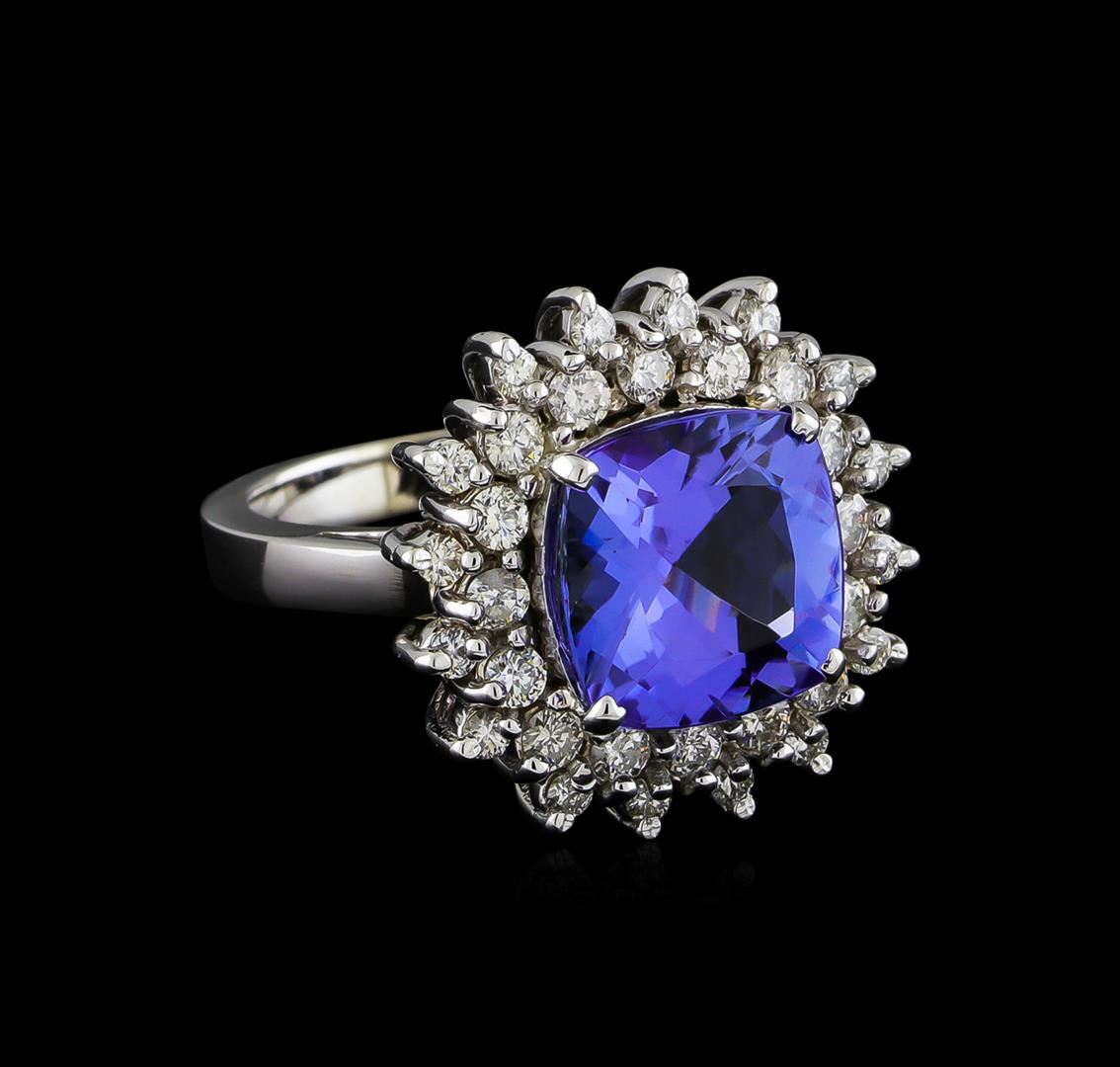 One electronically tested 14KT white gold ladies cast tanzanite and diamond ring with a bright polish finish. The featured tanzanite is set within a diamond floret supported by a ribbed under gallery, completed by a three millimeter wide band. Identified with markings of "14K". Condition is new, good workmanship. Containing: One prong set square cushion mixed cut natural tanzanite, measuring 10.70 x 10.60 x 6.30mm, approximate weight of 5.63ct., clarity is eye clean, type I, medium dark, very slightly grayish, bluish violet color, (GIA bV 6/3), cut is good. Transmitting light with no distortion, transparent. Colored Stone Grading Report attached. Graded in the setting. Tanzanite is a very rare gemstone that is only found in the country of Tanzania. Originally discovered in 1967. Tiffany & Company, named the stone Tanzanite. It is found in the Usumburu Mountains that border the Umba Valley of northern Tanzania. Tanzanite occurs in gray, brown, violet, blue, reddish-purple, & green. The gem is interesting because of its exceptional pleochroism. Rotated in different directions a tanzanite will exhibit multiple changes of color. Tanzanite has a low tolerance to ultrasonic cleaning, and should not be cleaned using this method. Sixteen prong set round brilliant cut diamonds, measuring 2.20 - 2.20 x 1.32mm (depth est.) approximate total weight of 16 Stones = 0.62ct. Graded in the setting. Clarity: I-1 to I-2. Color: G - I Sixteen prong set round brilliant cut diamonds, measuring 1.70 - 1.70 x 1.02mm (depth est.) approximate total weight of 16 Stones = 0.29ct. Graded in the setting. Clarity: SI-2 to I-2. Color: G - I. Total Weight of Colored Stones 5.63ct. Total Weight of Diamonds 0.91ct. Total Weight of Ring 10.84gm. AIG Appraised at $15,810.00.