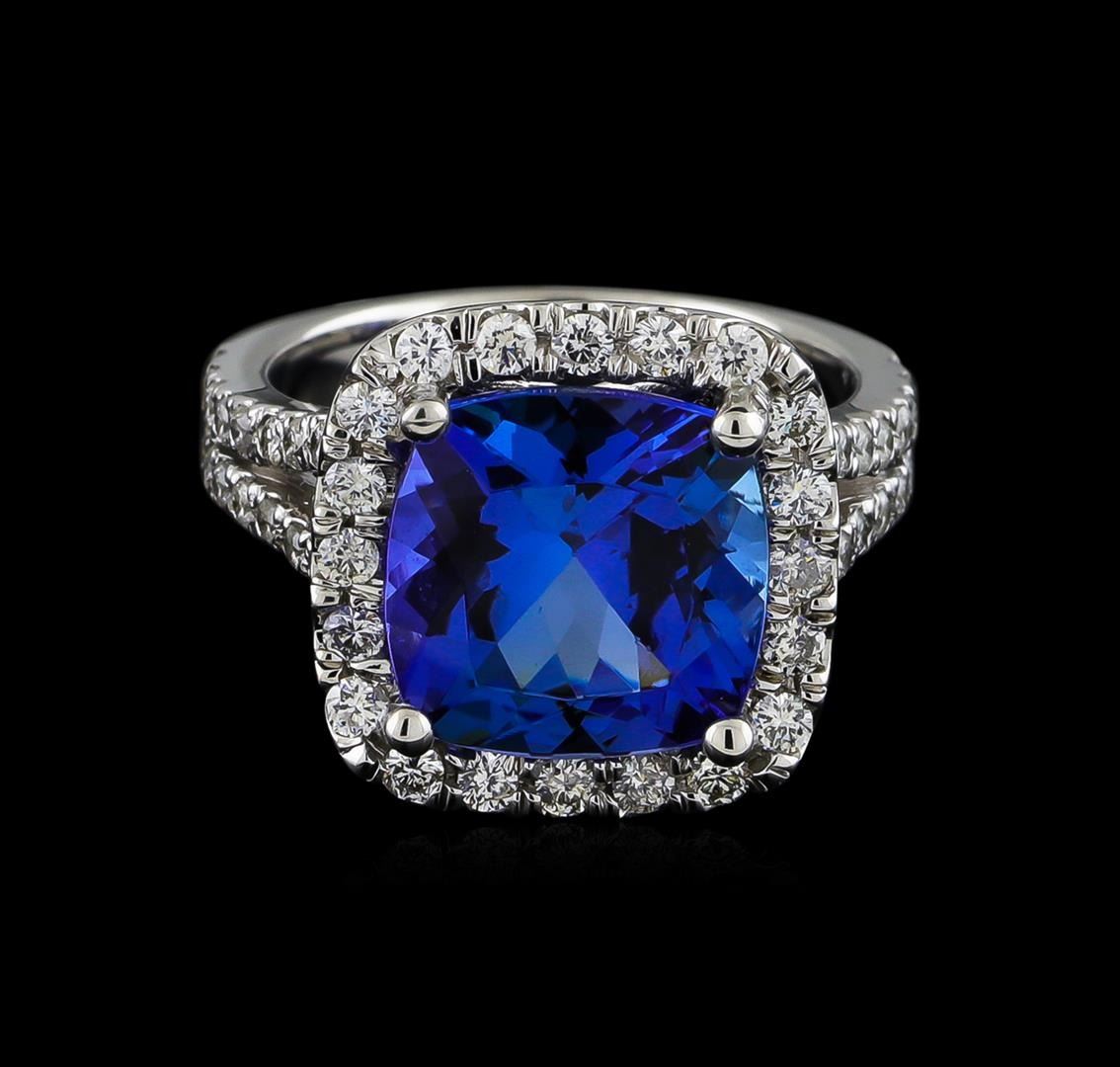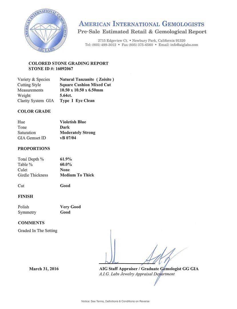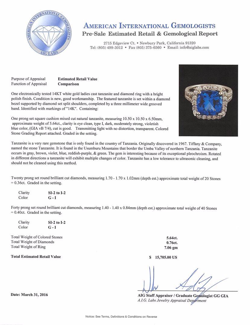 One electronically tested 14KT white gold ladies cast tanzanite and diamond ring with a bright polish finish. The featured tanzanite is set within a diamond bezel supported by diamond set split shoulders, completed by a three millimeter wide grooved band. Identified with markings of "14K". Condition is new, good workmanship. Containing: One prong set square cushion mixed cut natural tanzanite, measuring 10.50 x 10.50 x 6.50mm, approximate weight of 5.64ct., clarity is eye clean, type I, dark, moderately strong, violetish blue color, (GIA vB 7/4), cut is good. Transmitting light with no distortion, transparent. Colored Stone Grading Report attached. Graded in the setting. Tanzanite is a very rare gemstone that is only found in the country of Tanzania. Originally discovered in 1967. Tiffany & Company, named the stone Tanzanite. It is found in the Usumburu Mountains that border the Umba Valley of northern Tanzania. Tanzanite occurs in gray, brown, violet, blue, reddish-purple, & green. The gem is interesting because of its exceptional pleochroism. Rotated in different directions a tanzanite will exhibit multiple changes of color. Tanzanite has a low tolerance to ultrasonic cleaning, and should not be cleaned using this method. Twenty prong set round brilliant cut diamonds, measuring 1.70 - 1.70 x 1.02mm (depth est.) approximate total weight of 20 Stones = 0.36ct. Graded in the setting. Clarity: SI-2 to I-2. Color: G - I Forty prong set round brilliant cut diamonds, measuring 1.40 - 1.40 x 0.84mm (depth est.) approximate total weight of 40 Stones = 0.40ct. Graded in the setting. Clarity: SI-2 to I-2. Color: G - I. Total Weight of Colored Stones 5.64ct. Total Weight of Diamonds 0.76ct. Total Weight of Ring 7.06gm. AIG Appraised at $15,705.00.
