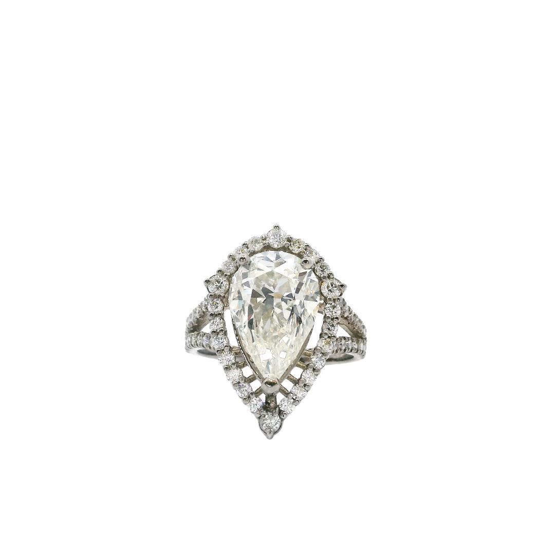 One electronically tested 14KT white gold lady's combination cast & assembled fashion teardrop motif wedding ring with a split shank basket halo with a bright polish finish. The featured lady's ring has a shank measuring 1.90 millimeters wide. Identified with markings of "14K". Condition is new, good workmanship.Containing: One pear shaped cut diamond, measuring 13.01 x 8.61 x 7.31mm (depth est.), 4.00% GTCF approximate weight of 5.03ct. Graded loose prior to setting in the EGL USA Laboratory, Report #US925647801D.Color HClarity SI-1 Cut Very Good Four prong set round brilliant cut diamonds, measuring 2.10 - 2.00 x 1.27mm (depth est.) approximate total weight of 4 Stones = 0.13ct. Graded in the setting.Color G - HClarity VS-2 to SI-1 Cut Very Good Twenty prong set round brilliant cut diamonds, measuring 1.60 - 1.50 x 0.96mm (depth est.) approximate total weight of 20 Stones = 0.29ct. Graded in the setting.Color G - HClarity VS-2 to SI-1 Cut Very Good Twenty-Eight prong set round brilliant cut diamonds, measuring 1.30 - 1.20 x 0.76mm (depth est.) approximate total weight of 28 Stones = 0.20ct. Graded in the setting.Color G - HClarity VS-2 to SI-1 Cut Very Good Total Weight of Diamonds