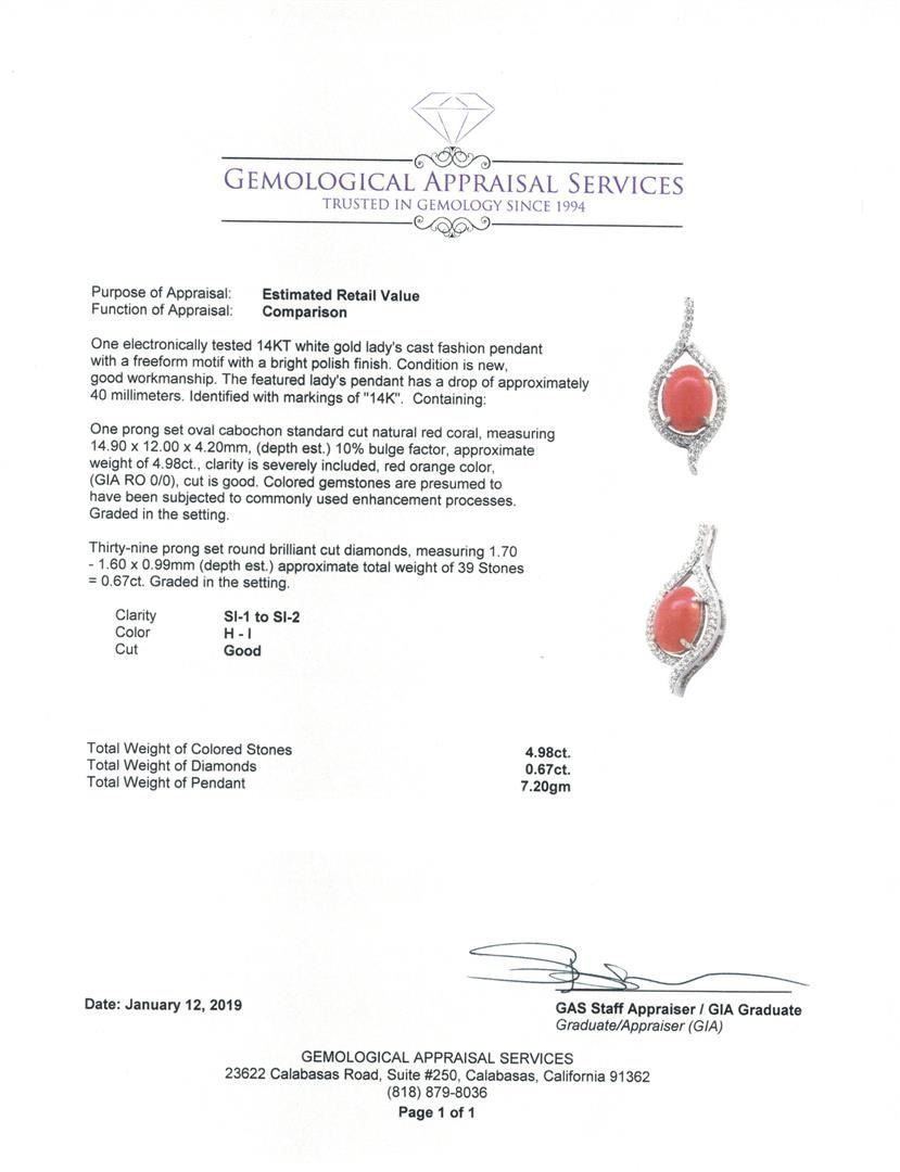 One electronically tested 14KT white gold lady's cast fashion pendant with a freeform motif with a bright polish finish. The featured lady's pendant has a drop of approximately 40 millimeters. Identified with markings of '14K'. Condition is new, good workmanship. Containing: One prong set oval cabochon standard cut natural red coral, measuring 14.90 x 12.00 x 4.20mm, (depth est.) 10%. bulge factor, approximate weight of 4.98ct., clarity is severely included, red orange color, (GIA RO 0/0), cut is good. Colored gemstones are presumed to have been subjected to commonly used enhancement processes. Graded in the setting. Thirty-Nine prong set round brilliant cut diamonds, measuring 1.70 - 1.60 x 0.99mm (depth est.) approximate total weight of 39 Stones = 0.67ct. Graded in the setting. Color H - I Clarity SI-1 to SI-2 Cut Good. Total Weight of Colored Stones 4.98ct.. Total Weight of Diamonds 0.67ct.. Total Weight of Pendant 7.20gm GAS Appraised at $3315.00. GAS Appraised.