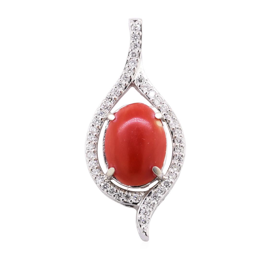 One electronically tested 14KT white gold lady's cast fashion pendant with a freeform motif with a bright polish finish. The featured lady's pendant has a drop of approximately 40 millimeters. Identified with markings of '14K'. Condition is new, good workmanship. Containing: One prong set oval cabochon standard cut natural red coral, measuring 14.90 x 12.00 x 4.20mm, (depth est.) 10%. bulge factor, approximate weight of 4.98ct., clarity is severely included, red orange color, (GIA RO 0/0), cut is good. Colored gemstones are presumed to have been subjected to commonly used enhancement processes. Graded in the setting. Thirty-Nine prong set round brilliant cut diamonds, measuring 1.70 - 1.60 x 0.99mm (depth est.) approximate total weight of 39 Stones = 0.67ct. Graded in the setting. Color H - I Clarity SI-1 to SI-2 Cut Good. Total Weight of Colored Stones 4.98ct.. Total Weight of Diamonds 0.67ct.. Total Weight of Pendant 7.20gm GAS Appraised at $3315.00. GAS Appraised.