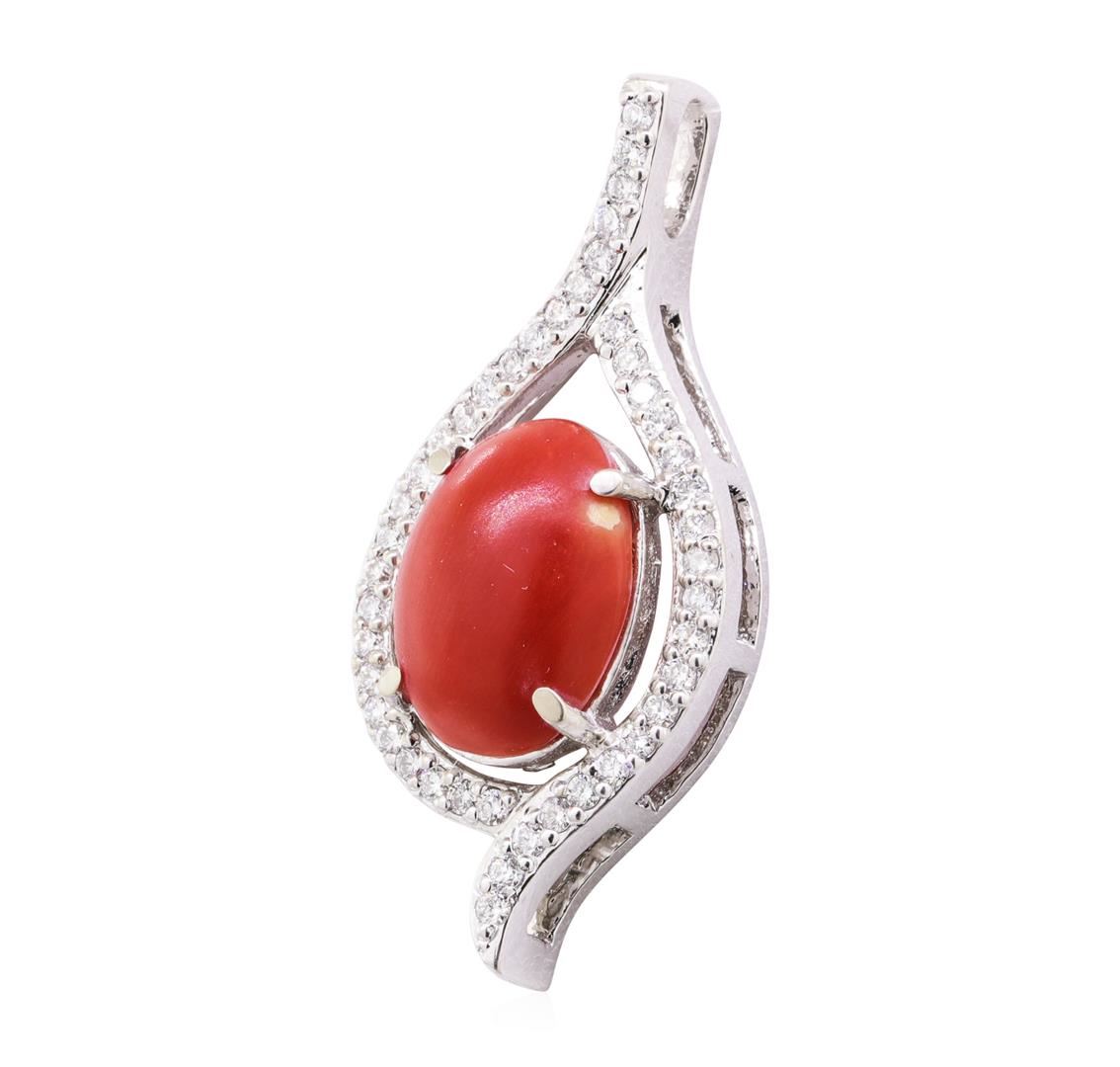One electronically tested 14KT white gold lady's cast fashion pendant with a freeform motif with a bright polish finish. The featured lady's pendant has a drop of approximately 40 millimeters. Identified with markings of '14K'. Condition is new, good workmanship. Containing: One prong set oval cabochon standard cut natural red coral, measuring 14.90 x 12.00 x 4.20mm, (depth est.) 10%. bulge factor, approximate weight of 4.98ct., clarity is severely included, red orange color, (GIA RO 0/0), cut is good. Colored gemstones are presumed to have been subjected to commonly used enhancement processes. Graded in the setting. Thirty-Nine prong set round brilliant cut diamonds, measuring 1.70 - 1.60 x 0.99mm (depth est.) approximate total weight of 39 Stones = 0.67ct. Graded in the setting. Color H - I Clarity SI-1 to SI-2 Cut Good. Total Weight of Colored Stones 4.98ct.. Total Weight of Diamonds 0.67ct.. Total Weight of Pendant 7.20gm GAS Appraised at $3315.00. GAS Appraised.