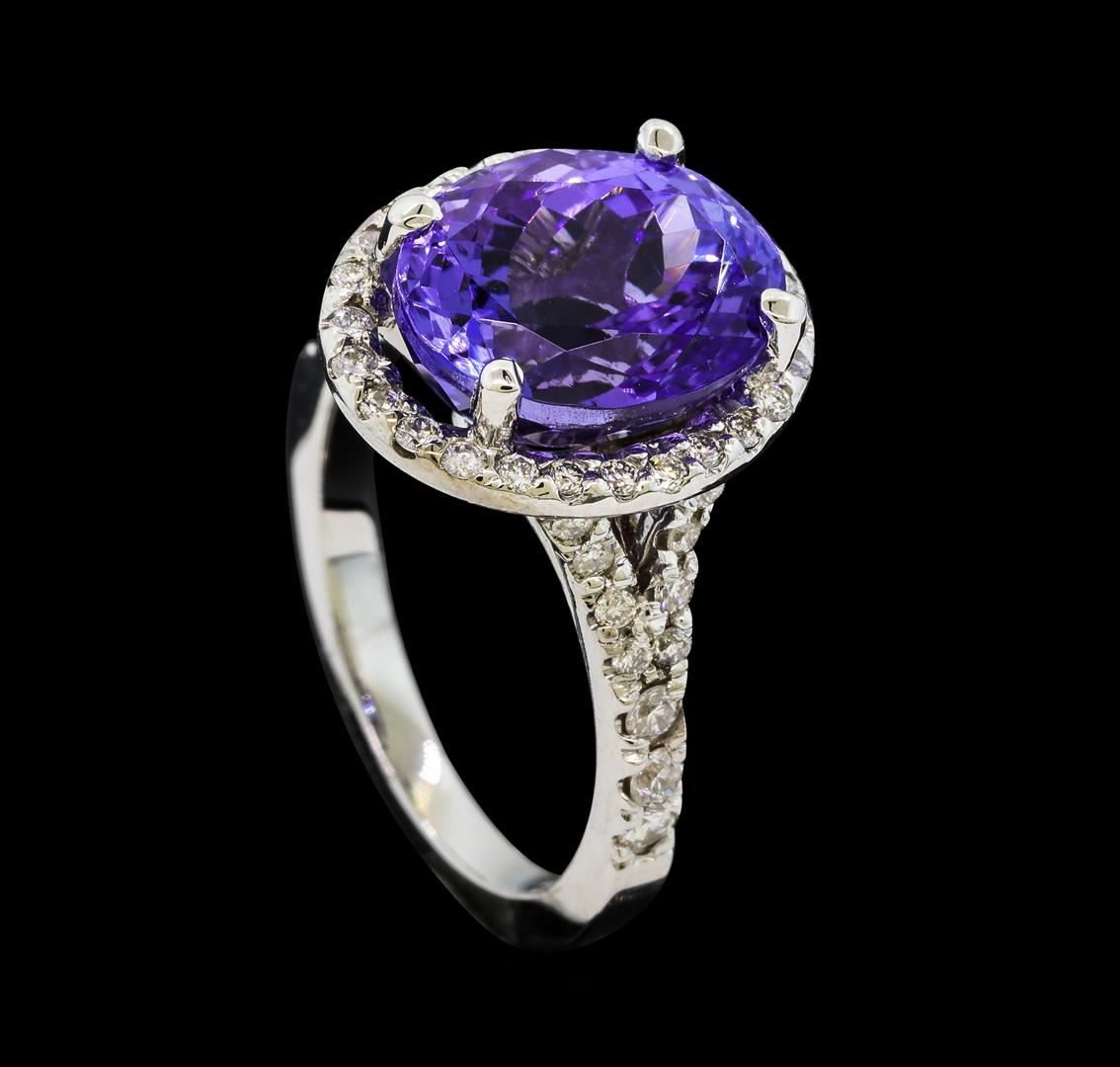 One electronically tested 14KT white gold lady's cast fashion ring with a split shank basket halo with a bright polish finish. The featured lady's ring has a shank measuring 2.08 millimeters wide. Identified with markings of '14K'. Condition is new, good workmanship. Containing: One prong set oval modified brilliant cut natural tanzanite, measuring 11.30 x 9.14 x 7.21mm, (depth est.) 8%. bulge factor, approximate weight of 5.65ct., clarity is eye clean, medium, moderately strong, violetish blue color, (GIA vB 5/4), cut is very good. Transmitting light with no distortion, transparent. Colored gemstones are presumed to have been subjected to commonly used enhancement processes. Graded in the setting. Six prong set round brilliant cut diamonds, measuring 1.80 - 1.70 x 1.07mm (depth est.) approximate total weight of 6 Stones = 0.12ct. Graded in the setting. Clarity SI-1 to SI-2. Color: H - I Cut Good Forty-Two prong set round brilliant cut diamonds, measuring 1.40 - 1.30 x 0.84mm (depth est.) approximate total weight of 42 Stones = 0.40ct. Graded in the setting. Clarity SI-1 to I-1. Color: G - I Cut Good. Total Weight of Colored Stones 5.65ct.. Total Weight of Diamonds 0.52ct.. Total Weight of Ring 5.50gm. GAS Appraised at $9,640.00.
