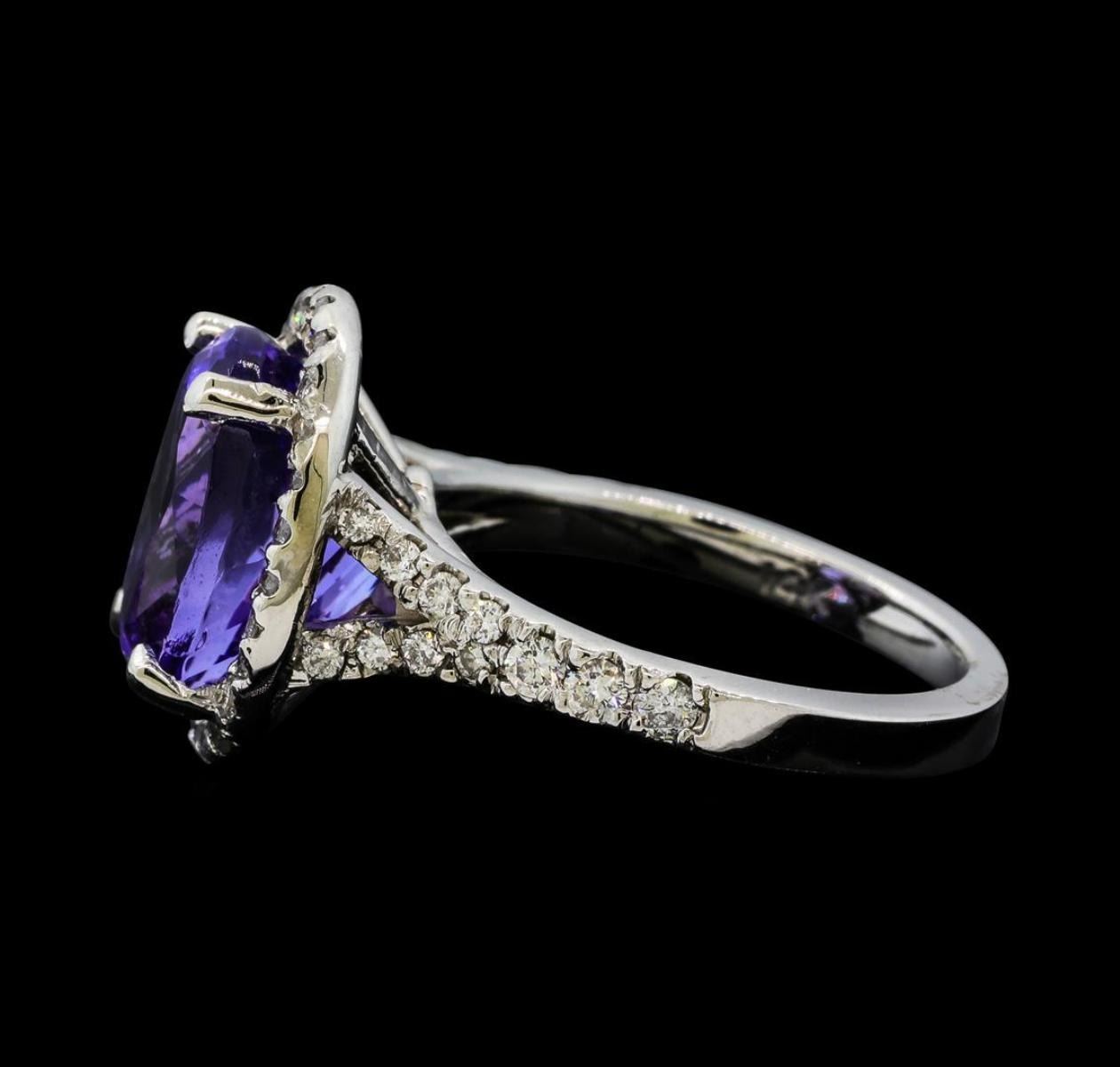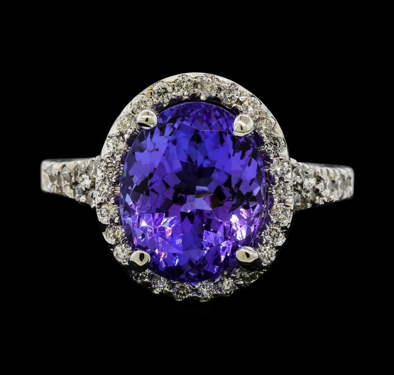 One electronically tested 14KT white gold lady's cast fashion ring with a split shank basket halo with a bright polish finish. The featured lady's ring has a shank measuring 2.08 millimeters wide. Identified with markings of '14K'. Condition is new, good workmanship. Containing: One prong set oval modified brilliant cut natural tanzanite, measuring 11.30 x 9.14 x 7.21mm, (depth est.) 8%. bulge factor, approximate weight of 5.65ct., clarity is eye clean, medium, moderately strong, violetish blue color, (GIA vB 5/4), cut is very good. Transmitting light with no distortion, transparent. Colored gemstones are presumed to have been subjected to commonly used enhancement processes. Graded in the setting. Six prong set round brilliant cut diamonds, measuring 1.80 - 1.70 x 1.07mm (depth est.) approximate total weight of 6 Stones = 0.12ct. Graded in the setting. Clarity SI-1 to SI-2. Color: H - I Cut Good Forty-Two prong set round brilliant cut diamonds, measuring 1.40 - 1.30 x 0.84mm (depth est.) approximate total weight of 42 Stones = 0.40 ct. Graded in the setting. Clarity SI-1 to I-1. Color: G - I Cut Good. Total Weight of Colored Stones 5.65ct.. Total Weight of Diamonds 0.52ct.. Total Weight of Ring 5.50gm. GAS Appraised.