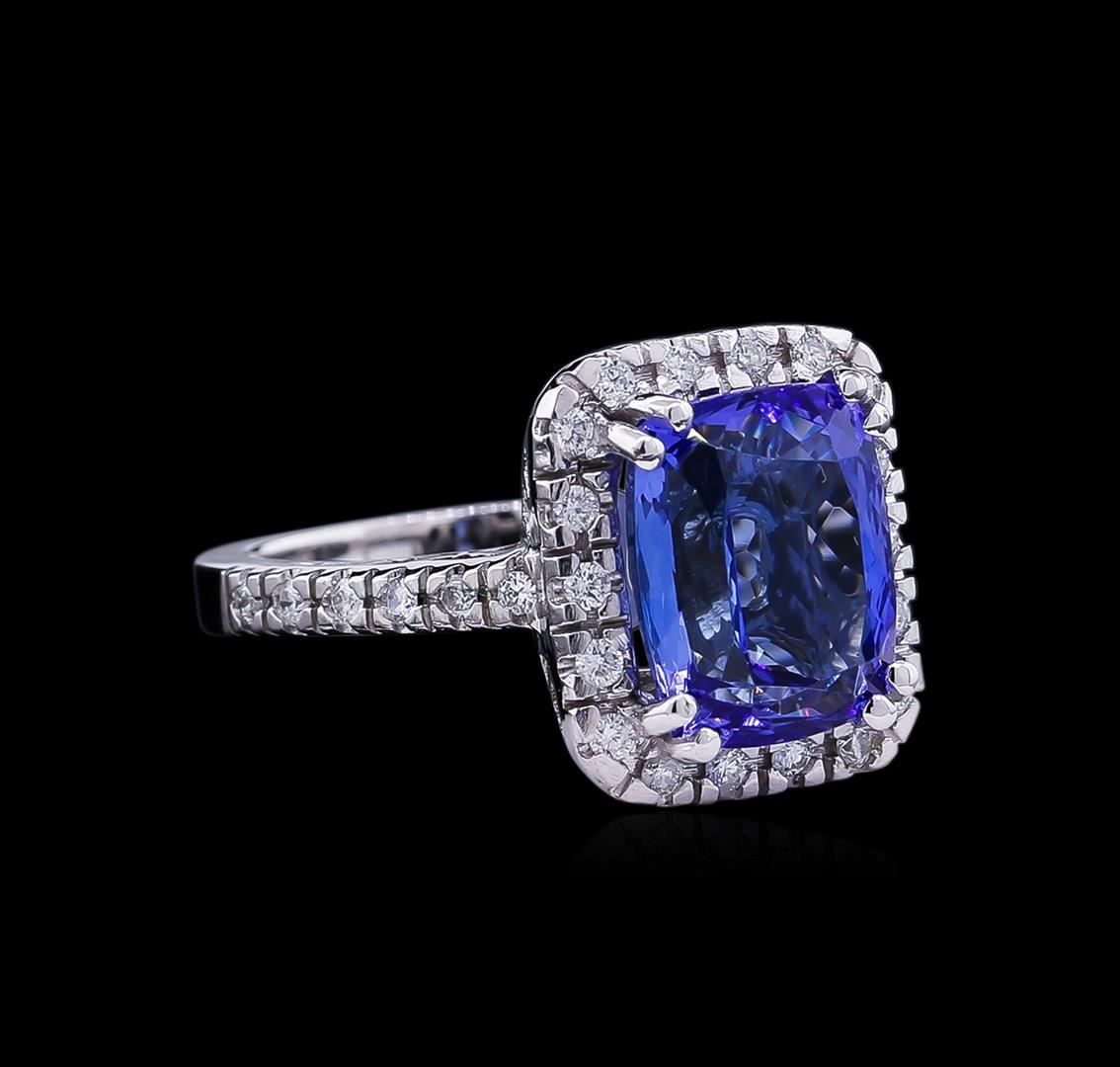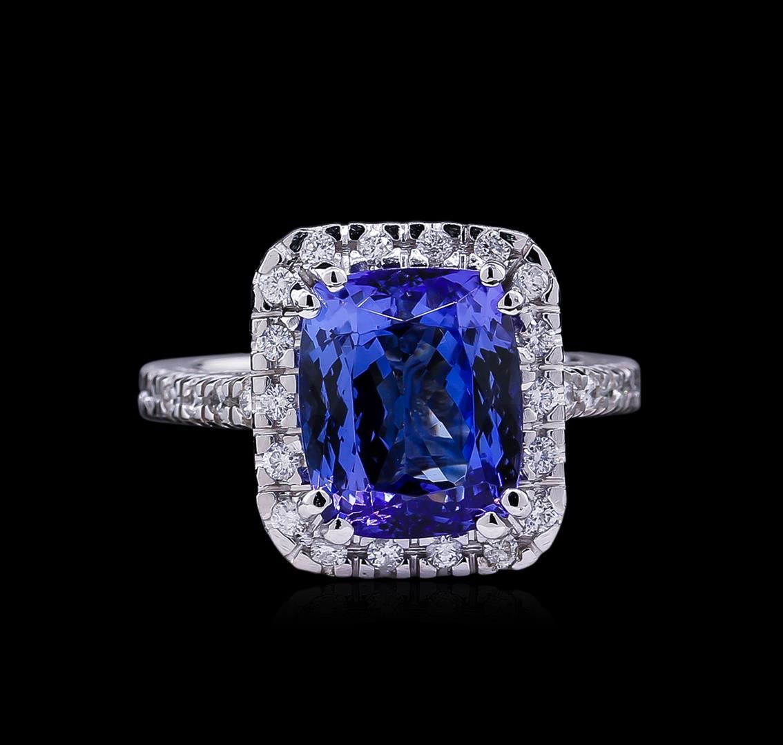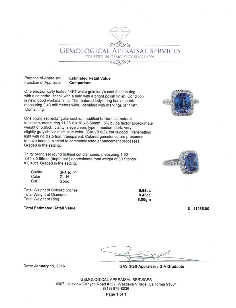 One electronically tested 14KT white gold lady's cast fashion ring with a cathedral shank with a halo with a bright polish finish. The featured lady's ring has a shank measuring 2.43 millimeters wide. Identified with markings of "14K". Condition is new, good workmanship. Containing: One prong set rectangular cushion modified brilliant cut natural tanzanite, measuring 11.25 x 9.18 x 6.50mm, 5%. bulge factor, approximate weight of 5.65ct., clarity is eye clean, type I, medium dark, very slightly grayish, violetish blue color, (GIA vB 6/3), cut is good. Transmitting light with no distortion, transparent. Colored gemstones are presumed to have been subjected to commonly used enhancement processes. Graded in the setting. Thirty prong set round brilliant cut diamonds, measuring 1.60 - 1.50 x 0.96mm (depth est.) approximate total weight of 30 Stones = 0.43ct. Graded in the setting. Clarity: SI-1 to I-1. Color: G - Good. Total Weight of Colored Stones 5.65ct. Total Weight of Diamonds 0.43ct. Total Weight of Ring 8.00gm. GAS Appraised at $11,085.00.