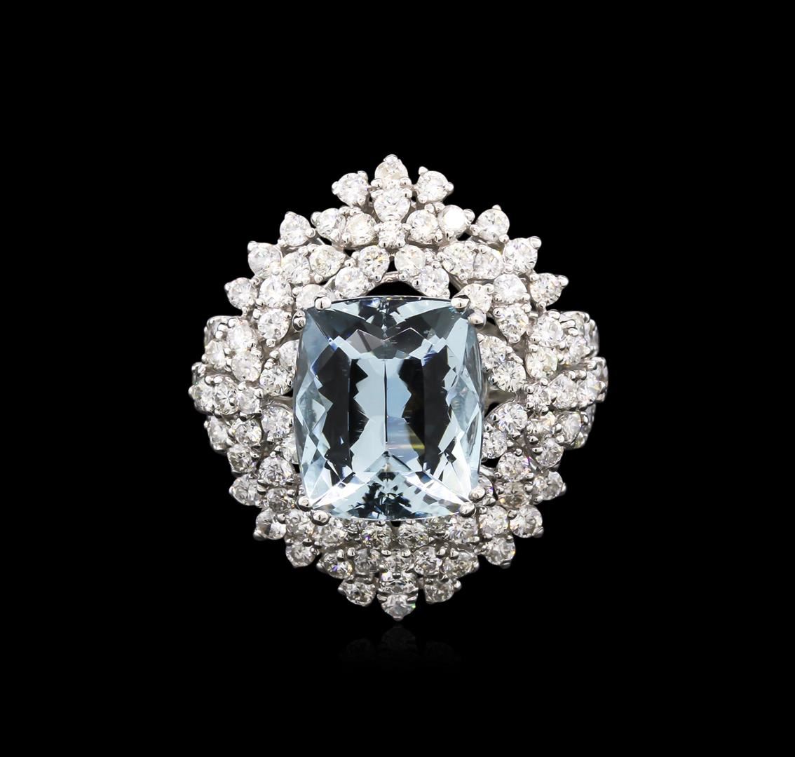 One electronically tested 18KT white gold lady's cast fashion ring with a bright polish finish. The featured lady's ring has a shank measuring 3.66 millimeters wide. Identified with markings of "18K". Condition is new, good workmanship. Containing: One prong set rectangular cushion modified brilliant cut natural aquamarine, measuring 12.10 x 10.23 x 7.20mm, approximate weight of 5.66ct., clarity is eye clean, type I, medium light, very slightly grayish, very slightly greenish blue color, (GIA vslgB 4/3), cut is very good. Transmitting light with no distortion, transparent. Colored gemstones are presumed to have been subjected to commonly used enhancement processes. Graded in the setting. Two prong set round brilliant cut diamonds, measuring 2.60 - 2.50 x 1.66mm (depth est.) approximate total weight of 2 Stones = 0.13ct. Graded in the setting. Clarity: SI-2 to I-1. Color: H - I. Cut Good One Hundred Two prong set round brilliant cut diamonds, measuring 2.00 - 1.60 x 1.17mm (depth est.) approximate total weight of 102 Stones = 2.46ct. Graded in the setting. Clarity: SI-1 to SI-2. Color: H - I. Cut Good. Total Weight of Colored Stones 5.66ct. Total Weight of Diamonds 2.59ct. Total Weight of Ring 9.80gm. GAS Appraised at $9,730.00.