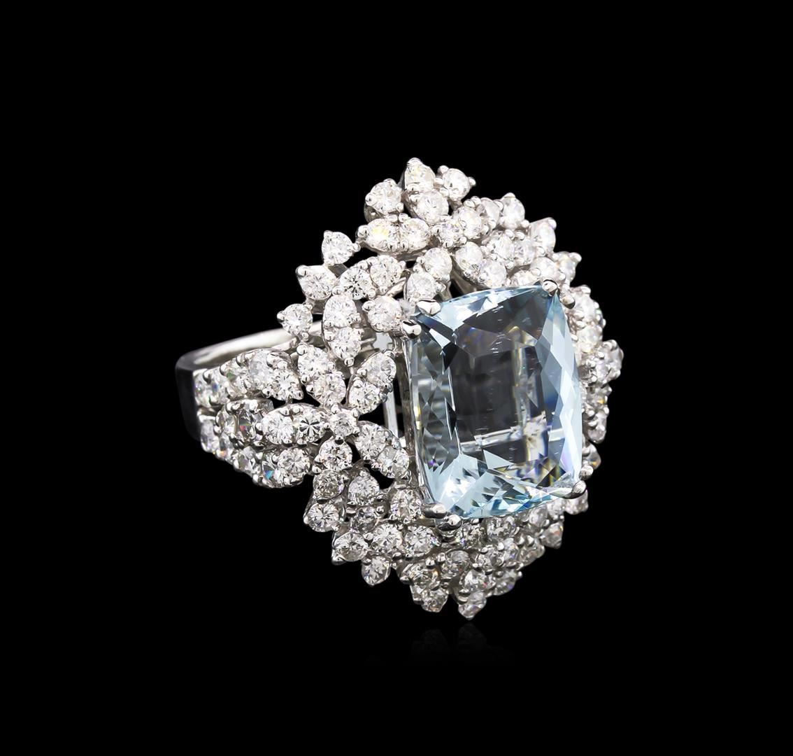 One electronically tested 18KT white gold lady's cast fashion ring with a bright polish finish. The featured lady's ring has a shank measuring 3.66 millimeters wide. Identified with markings of "18K". Condition is new, good workmanship. Containing: One prong set rectangular cushion modified brilliant cut natural aquamarine, measuring 12.10 x 10.23 x 7.20mm, approximate weight of 5.66ct., clarity is eye clean, type I, medium light, very slightly grayish, very slightly greenish blue color, (GIA vslgB 4/3), cut is very good. Transmitting light with no distortion, transparent. Colored gemstones are presumed to have been subjected to commonly used enhancement processes. Graded in the setting. Two prong set round brilliant cut diamonds, measuring 2.60 - 2.50 x 1.66mm (depth est.) approximate total weight of 2 Stones = 0.13ct. Graded in the setting. Clarity: SI-2 to I-1. Color: H - I. Cut Good One Hundred Two prong set round brilliant cut diamonds, measuring 2.00 - 1.60 x 1.17mm (depth est.) approximate total weight of 102 Stones = 2.46ct. Graded in the setting. Clarity: SI-1 to SI-2. Color: H - I. Cut Good. Total Weight of Colored Stones 5.66ct. Total Weight of Diamonds 2.59ct. Total Weight of Ring 9.80gm. GAS Appraised at $9,730.00.