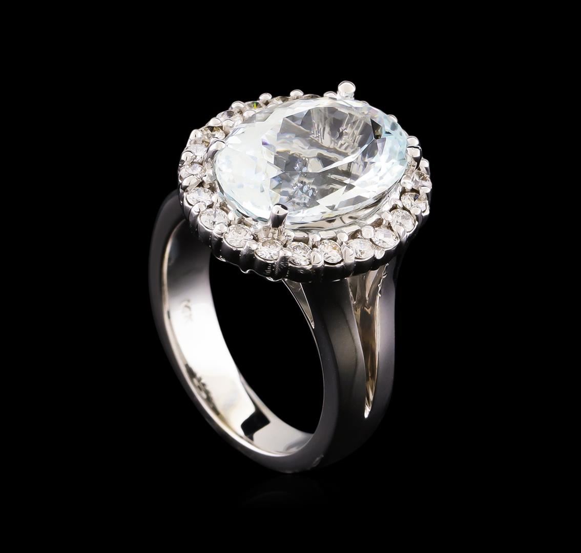 One electronically tested 14KT white gold lady's cast fashion ring with a split shank basket halo with a bright polish finish. The featured lady's ring has a shank measuring 3.94 millimeters wide. Identified with markings of "14K". Condition is new, good workmanship. Containing: One prong set oval modified brilliant cut natural aquamarine, measuring 13.96 x 10.04 x 7.10mm, approximate weight of 5.67ct., clarity is slightly included, light, very slightly grayish, greenish blue color, (GIA gB 3/3), cut is good. Transmitting light with no distortion, transparent. Colored gemstones are presumed to have been subjected to commonly used enhancement processes. Graded in the setting. Twenty-Two prong set round brilliant cut diamonds, measuring 1.90 - 1.80 x 1.15mm (depth est.) approximate total weight of 22 Stones = 0.54ct. Graded in the setting. Clarity: SI-1 to SI-2. Color: G - Good. Total Weight of Colored Stones 5.67ct. Total Weight of Diamonds 0.54ct. Total Weight of Ring 10.80gm. GAS Appraised at $7,040.00.