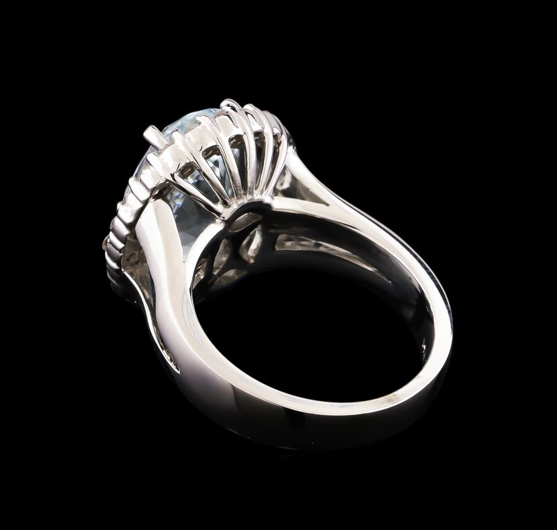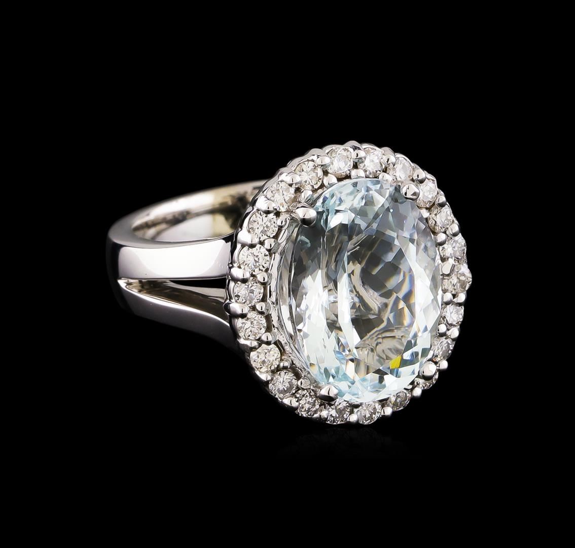 One electronically tested 14KT white gold lady's cast fashion ring with a split shank basket halo with a bright polish finish. The featured lady's ring has a shank measuring 3.94 millimeters wide. Identified with markings of "14K". Condition is new, good workmanship. Containing: One prong set oval modified brilliant cut natural aquamarine, measuring 13.96 x 10.04 x 7.10mm, approximate weight of 5.67ct., clarity is slightly included, light, very slightly grayish, greenish blue color, (GIA gB 3/3), cut is good. Transmitting light with no distortion, transparent. Colored gemstones are presumed to have been subjected to commonly used enhancement processes. Graded in the setting. Twenty-Two prong set round brilliant cut diamonds, measuring 1.90 - 1.80 x 1.15mm (depth est.) approximate total weight of 22 Stones = 0.54ct. Graded in the setting. Clarity: SI-1 to SI-2. Color: G - Good. Total Weight of Colored Stones 5.67ct. Total Weight of Diamonds 0.54ct. Total Weight of Ring 10.80gm. GAS Appraised at $7,040.00.