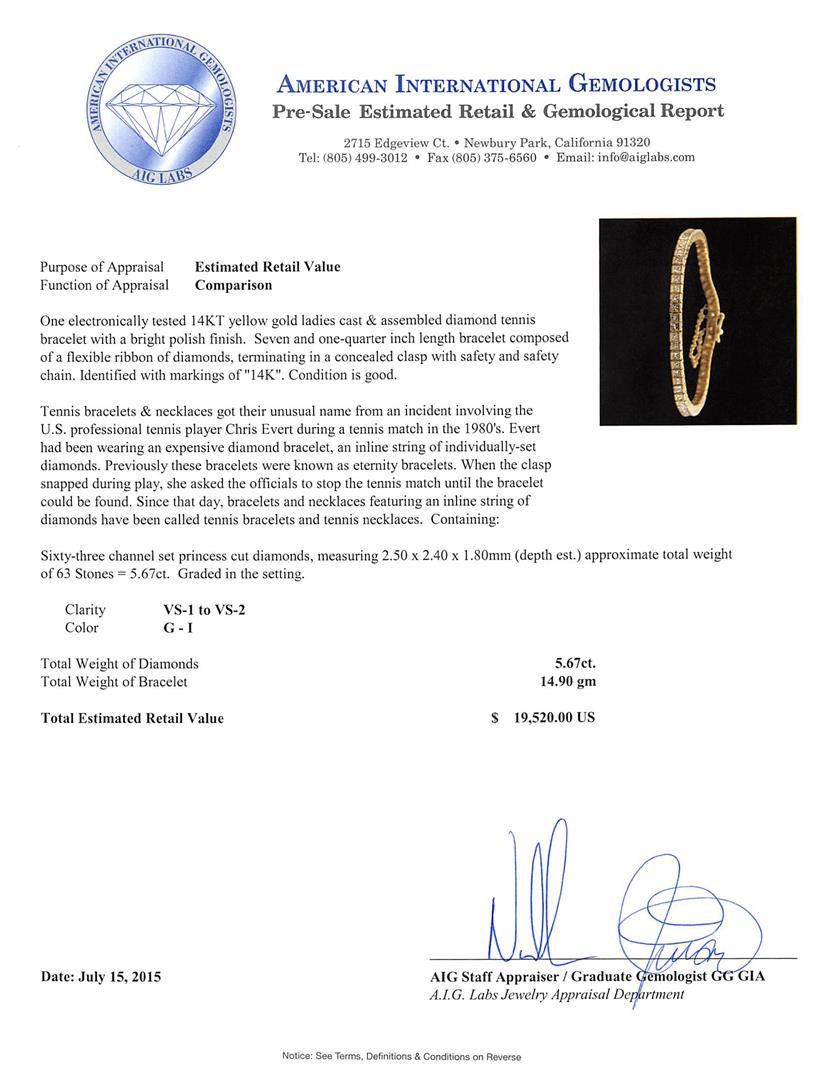 One electronically tested 14KT yellow gold ladies cast & assembled diamond tennis bracelet with a bright polish finish. Seven and one-quarter inch length bracelet composed of a flexible ribbon of diamonds, terminating in a concealed clasp with safety and safety chain. Identified with markings of "14K". Condition is good. Tennis bracelets & necklaces got their unusual name from an incident involving the U.S. professional tennis player Chris Evert during a tennis match in the 1980's. Evert had been wearing an expensive diamond bracelet, an inline string of individually-set diamonds. Previously these bracelets were known as eternity bracelets. When the clasp snapped during play, she asked the officials to stop the tennis match until the bracelet could be found. Since that day, bracelets and necklaces featuring an inline string of diamonds have been called tennis bracelets and tennis necklaces. Containing: Sixty-Three channel set princess cut diamonds, measuring 2.50 x 2.40 x 1.80mm (depth est.) approximate total weight of 63 Stones = 5.67ct. Graded in the setting. Clarity: VS-1 to VS-2. Color: G - I. Total Weight of Diamonds 5.67ct. Total Weight of Bracelet 14.90gm. AIG Appraised at $19,520.00.