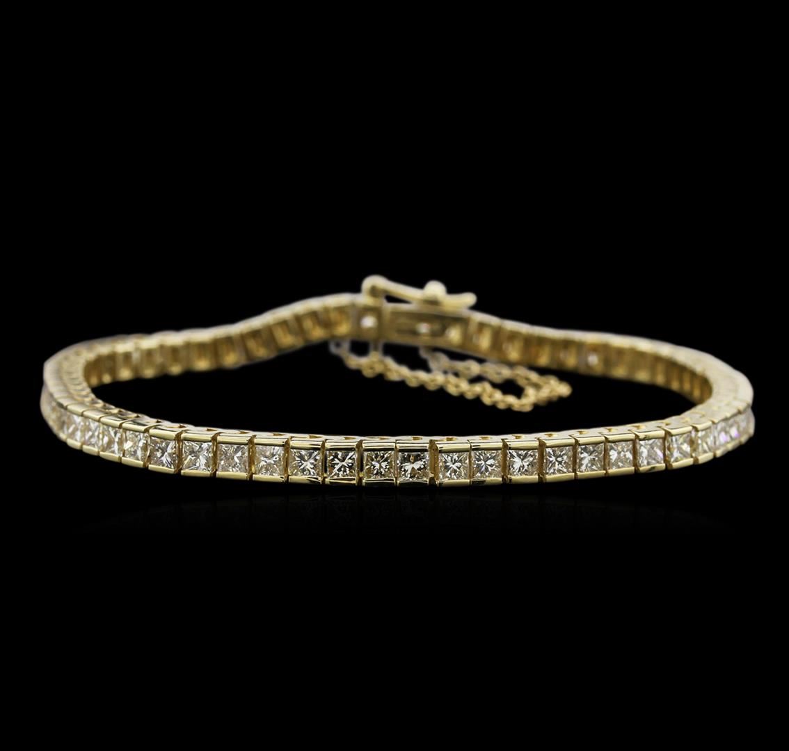 One electronically tested 14KT yellow gold ladies cast & assembled diamond tennis bracelet with a bright polish finish. Seven and one-quarter inch length bracelet composed of a flexible ribbon of diamonds, terminating in a concealed clasp with safety and safety chain. Identified with markings of "14K". Condition is good. Tennis bracelets & necklaces got their unusual name from an incident involving the U.S. professional tennis player Chris Evert during a tennis match in the 1980's. Evert had been wearing an expensive diamond bracelet, an inline string of individually-set diamonds. Previously these bracelets were known as eternity bracelets. When the clasp snapped during play, she asked the officials to stop the tennis match until the bracelet could be found. Since that day, bracelets and necklaces featuring an inline string of diamonds have been called tennis bracelets and tennis necklaces. Containing: Sixty-Three channel set princess cut diamonds, measuring 2.50 x 2.40 x 1.80mm (depth est.) approximate total weight of 63 Stones = 5.67ct. Graded in the setting. Clarity: VS-1 to VS-2. Color: G - I. Total Weight of Diamonds 5.67ct. Total Weight of Bracelet 14.90gm. AIG Appraised at $19,520.00.